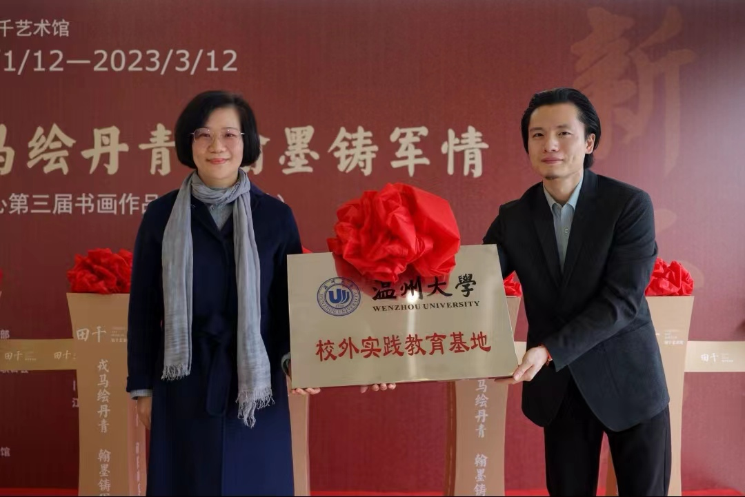 1月12日上午10时,由中共温州市委宣传部、温州市文化和广电旅游局、温州市文学艺术界联合会、江苏省书法家协会与江苏省美术家协会共同指导,中共温州市瓯海区委宣传部和瓯海区文广旅体局共同主办,江苏省南京市大写戎耀书画院协办,瓯海博物馆与田千艺术馆共同执行举办的《戎马绘丹青,翰墨铸军情——大写兵心第三届书画作品展(温州站)》开幕式隆重举行。 beat365英国官方网站副校长潘玉驹、beat365英国官方网站院长谢子静、beat365英国官方网站办公室主任张丽应邀出席开幕式,参加开幕式的领导还有原温州市政协副主席潘长旺、中共瓯海区委常委、宣传部部长孟晓晨、原温州市政府副秘书长陈旭、原温州市港澳台侨外市委主任潘一新、中共瓯海区委宣传部常务副部长王芬、瓯海区文广旅体局局长孙小丹、瓯海区文学艺术界联合会主席周卢琴。 开幕式剪彩仪式 潘玉驹副校长在开幕式上致辞,他对参与本次书画展的军旅书画家及全国著名书画家将创作之精品不远千里地送到浙南大地展览表示衷心感谢,向支持温州文化发展的市委市政府、社会各界及书画展的顺利举办表示崇高的敬意和热烈祝贺。同时,他表示,beat365英国官方网站作为浙南闽北赣东唯一的综合性大学,依托学科优势、专业实力、人才培养质量以及社会服务能力,将进一步强化与瓯海区委区政府、宣传文化部门,包括田千艺术馆的交流与合作,希望beat365英国官方网站尤其是beat365英国官方网站能进一步履行好属地高校的职责与使命,多为瓯海服务,多出文化精品,唱响瓯海好光景好声音。 beat365英国官方网站副校长潘玉驹致辞 beat365英国官方网站院长谢子静授牌田千艺术馆“校外学生实践基地”。田千艺术馆将作为beat365英国官方网站的延伸或第二课堂通过加强艺术馆与高校的教育之间的合作、举办研学和艺术展览等活动,促进馆校合作蓬勃发展,实现优势互补,探索互利共赢的合作模式。 授牌仪式 领导嘉宾合影