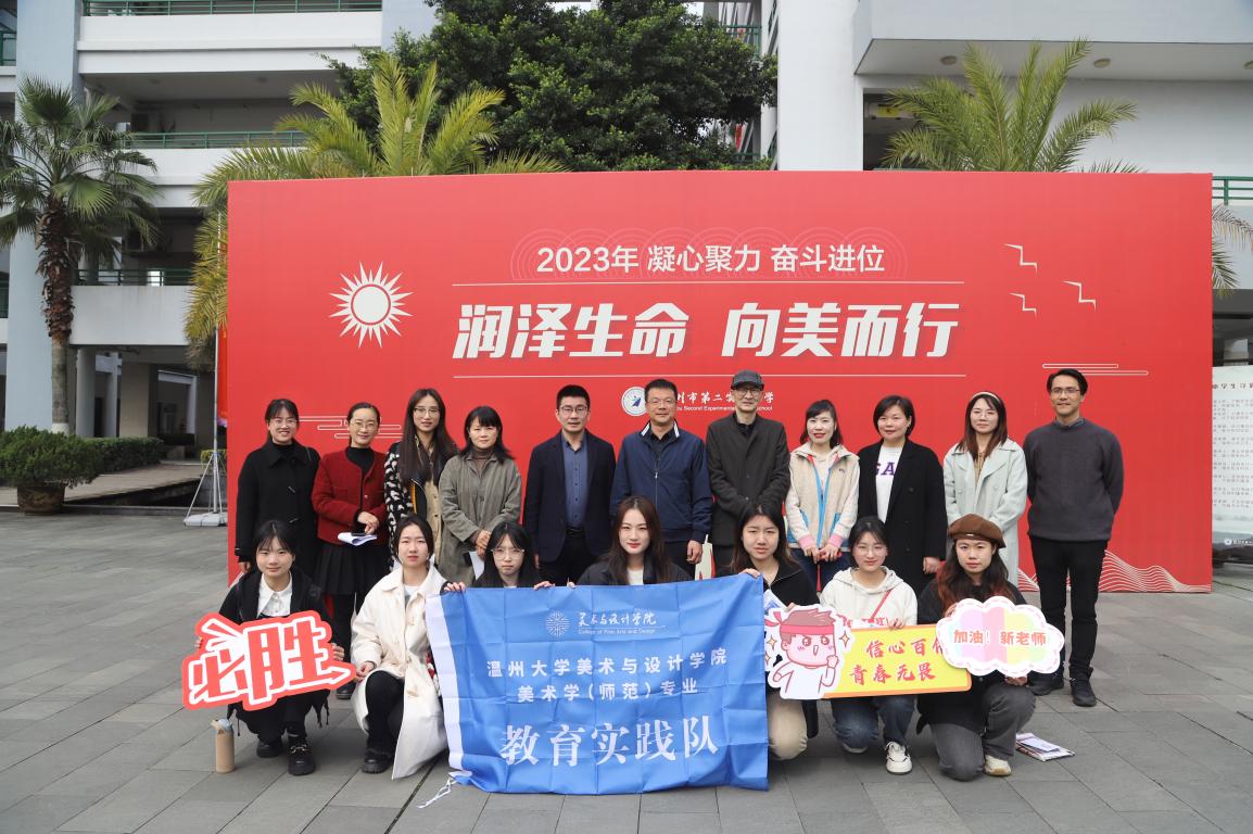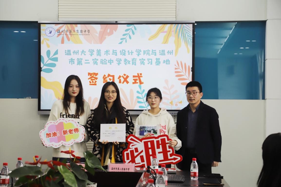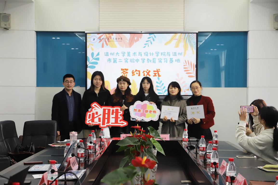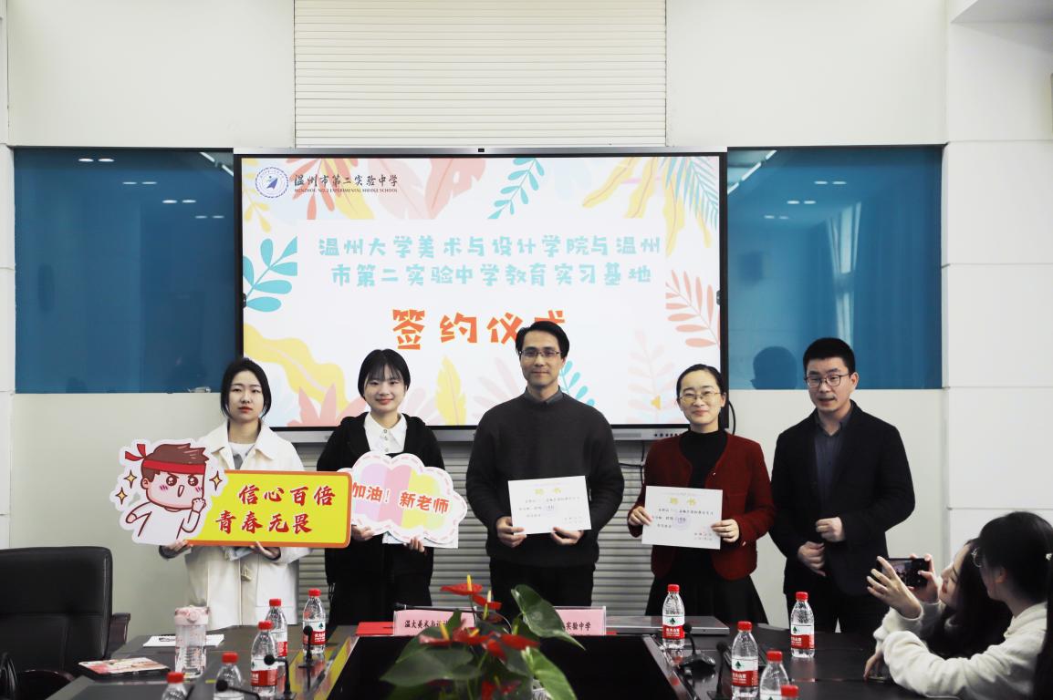 春光复始,适常如新。3月21日上午,beat365英国官方网站访企拓岗暨教育实习基地签约会在温州第二实验中学隆重举行。beat365官网胡建南副教授、谢艳芳老师、范佩宏老师、实验中学实习指导老师们以及20级美术师范7名实习生参加活动,beat365官网副院长胡文超、温州第二实验中学校长潘智敏、副校长陈珊景出席签约会。会议由第二实验中学教务处主任冯超伟老师主持。 温州第二实验中学校长潘智敏致欢迎词 潘智敏校长代表学校对beat365英国官方网站领导、老师和实习生们的到来表示热烈欢迎,并介绍了第二实验中学的办学思想、办学特色以及正在实施的“大阅读”“大体育”“大美育”有机融合的教育项目,希望实习老师在学校的美育课程设计、校园文化建设中贡献新的智慧。最后,潘校长介绍了四位实习指导老师,并预祝与beat365英国官方网站第一次实习合作圆满完成。 beat365英国官方网站副院长胡文超发表讲话 胡文超副院长首先为温二实给予beat365官网实习工作的支持表示感谢,接着从美院创办历史出发,详细介绍了beat365官网基本情况以及美术学(师范)专业建设和人才培养等方面情况。最后,叮嘱各位实习生加强思想认识,重视实践,珍惜此次机会,虚心向前辈请教,希望通过本次实习,各位实习生能积累一线课堂教育经验,汲取教育智慧,进一步修炼内功,赋能专业成长,同时他提醒各位实习生树立纪律意识,服从安排,重视安全问题。 在所有与会人员的见证下,胡院长和潘校长签署了教育实践合作协议,共同为就业实习基地揭牌。 签约与揭牌仪式 随后,胡院长和潘校长为第二实验中学的指导老师们颁发聘书并合影留念。潘校长为实习生赠送了自己亲笔签名的第二实验中学定制明信片,副校长陈珊景为实习生送上自己设计的“仰望星空”口罩。冯超伟主任代表导师们,为师生送上祝福,她说:希望你们仰望星空树立理想,脚踏实地砥砺前行,顺利地完成实习,收获知识,收获一段美好的回忆。 指导老师与实习生结对仪式 会议最后,胡建南教授与指导老师一起对各位实习生实习课程要求进行说明,并对实习生的汇报课程给予期待。 本次签约仪式加深了beat365英国官方网站与第二实验中学两校之间的合作深度,相信在双方的共同努力下,日后在教学经验分享、名师结对帮扶、资源共享、实习就业等方面进一步扩大交流,丰富合作内涵,实现两校教育事业的共同进步。相信通过实习,更好助力beat365官网美术学(师范)专业学子的发展,为他们走上教师岗位做出更大的贡献。