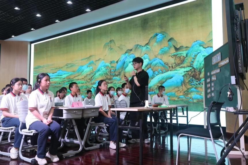第二节课是由温州南浦实验中学实习生代表姜景皓带来的七年级课程《北京故宫—千里江山图》。课堂以视频方式导入,带同学走进画中世界,老师从多角度讲解分析画作,让流行音乐与古画韵律相结合,碰撞出了不一样的火花。