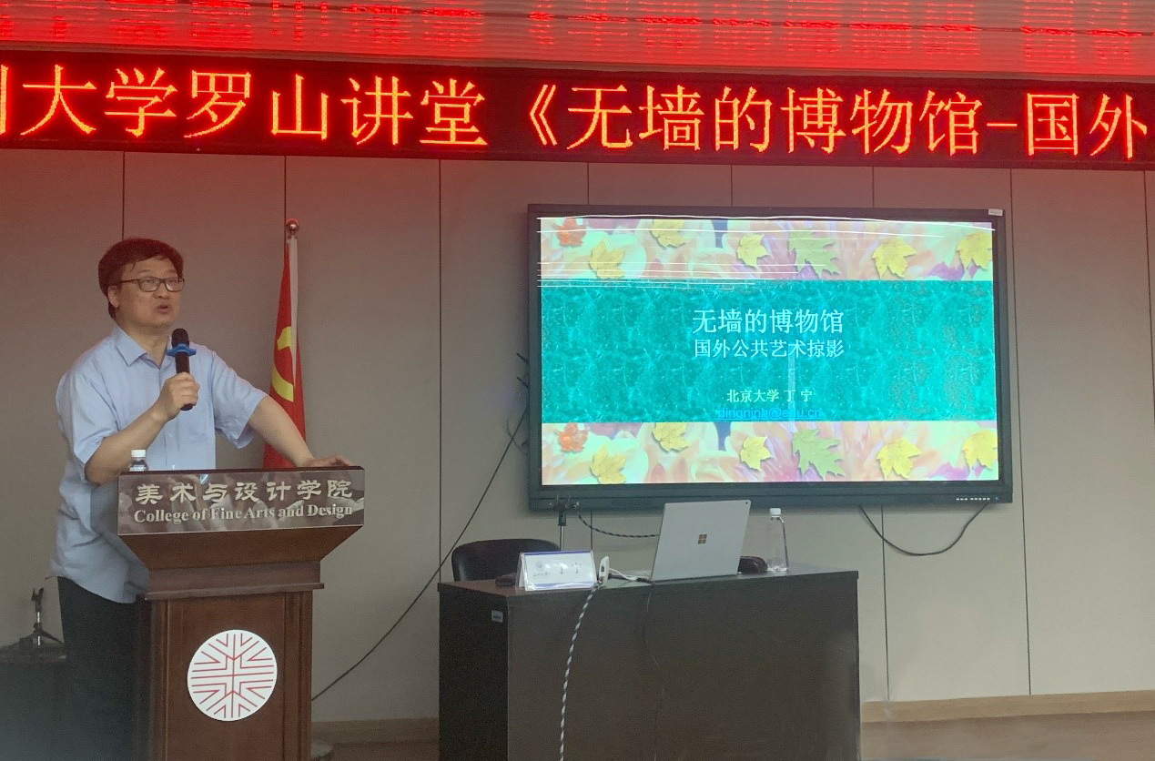 5月28日下午,北京大学艺术学院教授、博士生导师、教育部美术类专业教学指导委员会副主任委员丁宁教授莅临beat365官网“罗山讲堂”,为广大师生带来“无墙的博物馆——国外公共艺术掠影”学术讲座。本场讲座系beat365英国官方网站90周年校庆系列学术活动之一,由副院长顾任飞教授主持,学院教师、硕士生、本科生80多人参加。