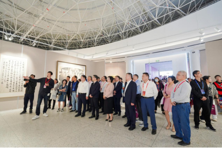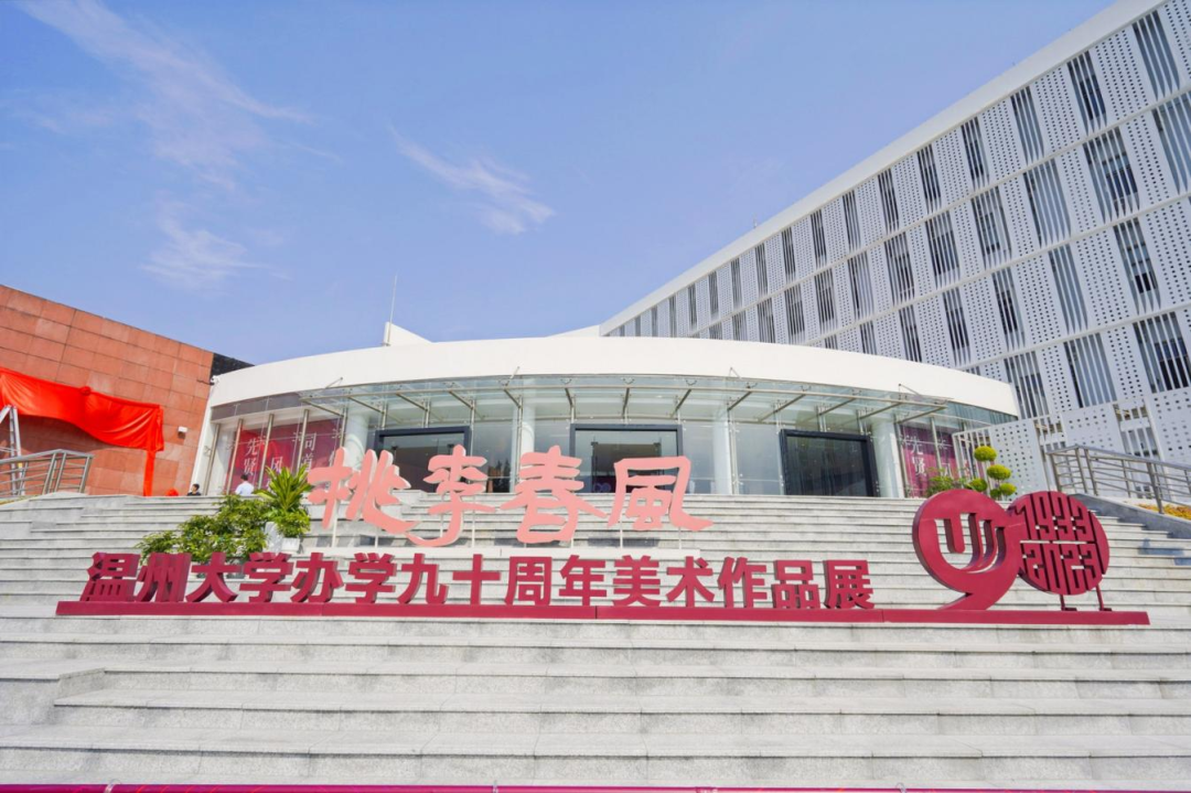 仪式结束,领导、嘉宾、校友、师生共同进入美术馆参观作品展。本次展览分为“先贤风雅”“同道传薪”两大板块,共展出了156位先贤、名家、教师和校友作品,涵盖国画、油画、版画、水彩画、综合绘画、书法、篆刻等种类。展览基于近现代中国美育运动、美术创作的宏大背景,对近代以来温州的书画创作与教育做一个初步的回溯,以近代几位具有代表性的书画大家与“美育大先生”开篇,延伸至温州区域美术创作,以及当代在全国卓有影响的重彩工笔画、书法、版画、水彩画的温籍代表作者;同时梳理学校的美育脉络,展示几代温大人的书画创作,弘扬与传播beat365英国官方网站的人文风采。