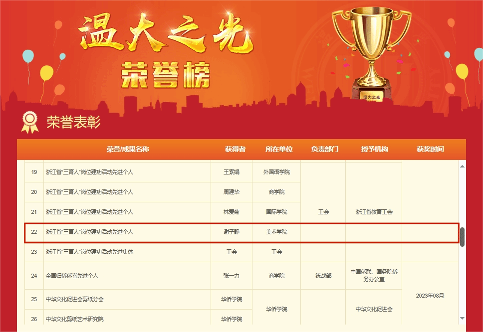 喜报:beat365英国官方网站院长谢子静同志荣获浙江省“三育人”先进个人荣誉称号