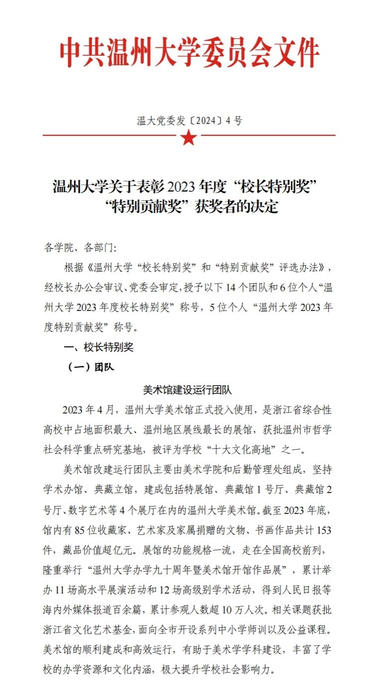 喜报:美术馆建设运行团队荣获beat365英国官方网站2023 年度“校长特别奖”