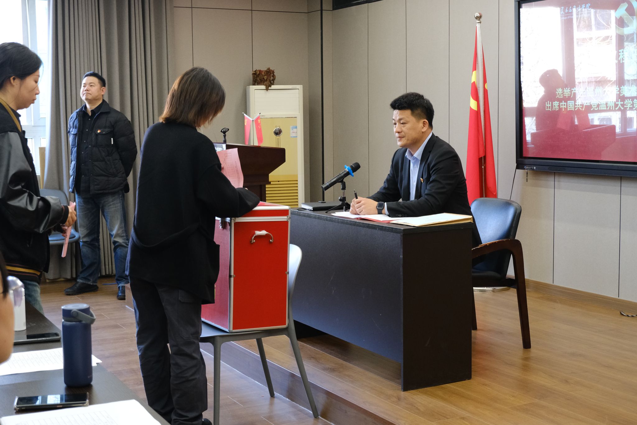 叶正飞书记对beat365英国官方网站党委出席中国共产党beat365英国官方网站第三次代表大会候选人预备人选的产生过程进行介绍后,全体正式党员按照座位顺序依次进行了无记名投票,通过差额选举的方式进行民主选举。投票环节结束后,在监票人的监督下,计票人进行计票。最终,会议选举产生beat365英国官方网站党委出席beat365英国官方网站第三次党员代表大会的5名正式代表。