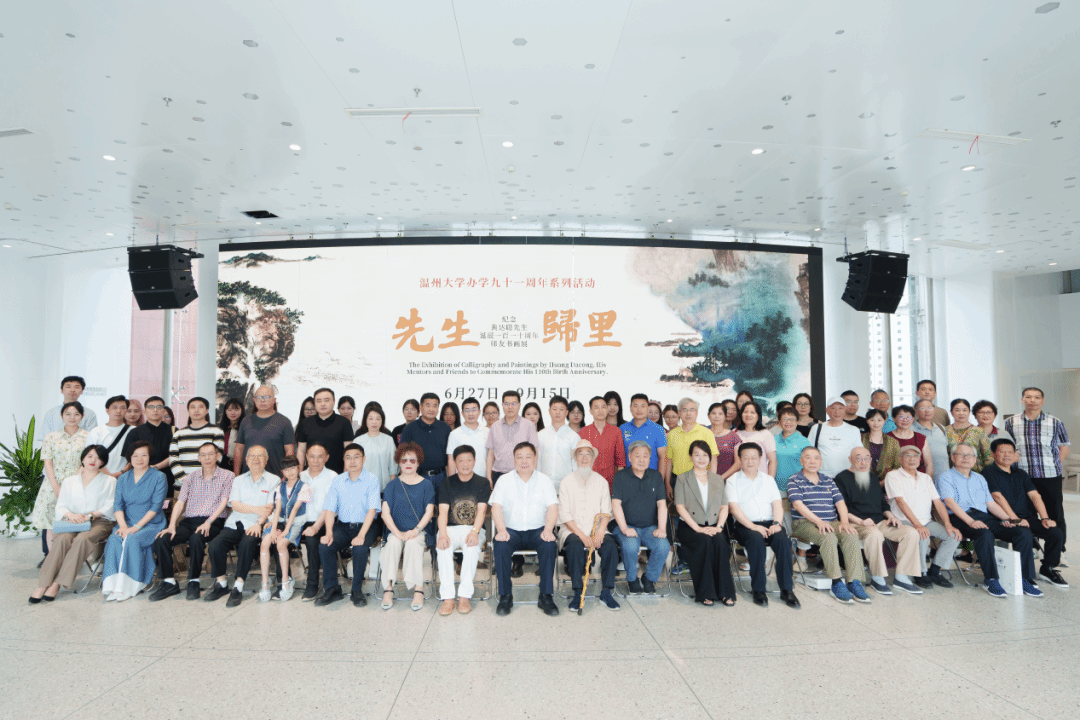 最后,beat365英国官方网站校长赵敏,黄达聪次子黄则诚,浙江省文史研究馆馆员张如元,浙江省文史研究馆馆员马亦钊,温州市文学艺术届联合会副主席谢子康,温州市社会科学界联合会副主席叶雪影,中国国家工美协会常务理事、上海海上水墨画院院长、黄达聪学生徐志良,温州市鹿城区原区长王超俊,beat365英国官方网站院长谢子静,温州衍园美术馆馆长沈国林共同上台,为“先生归里——黄达聪诞辰110周年师友书画展”启幕。