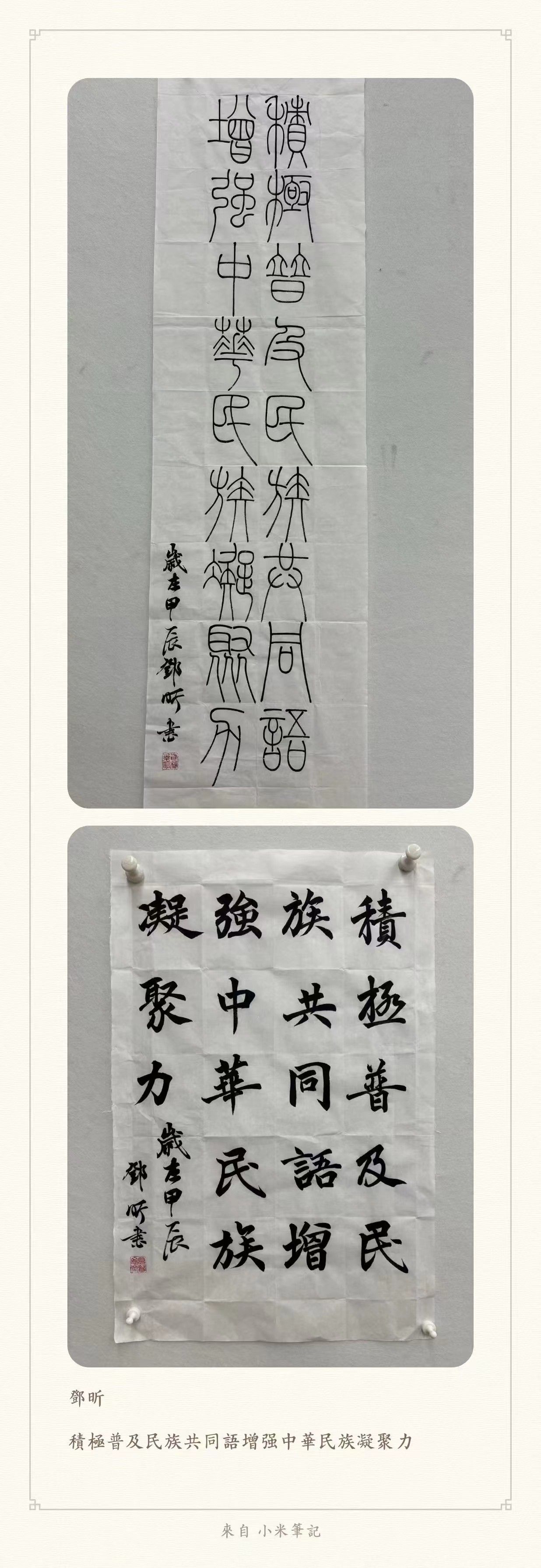 beat365英国官方网站于2024年9月16日﹣2024年9月22日期间结合自身专业特色开展了推广普通话相关文艺活动。期间,beat365官网组织书法学专业同学进行了以宣传普通话为主题内容的书法创作活动,并在美院书法长廊进行了现场展示宣传。普通话和书法都是中国传统文化的重要组成部分。普通话作为国家通用语言,是中国最重要的交流工具之一,而书法作为中国特有的艺术形式,更是中华文化的瑰宝之一。将普通话和书法进行结合,不仅可以展现传统书法的艺术魅力,同时也更有力于普通话的普及,彰显中国传统文化的魅力。活动现场照片及部分普通话主题书法作品