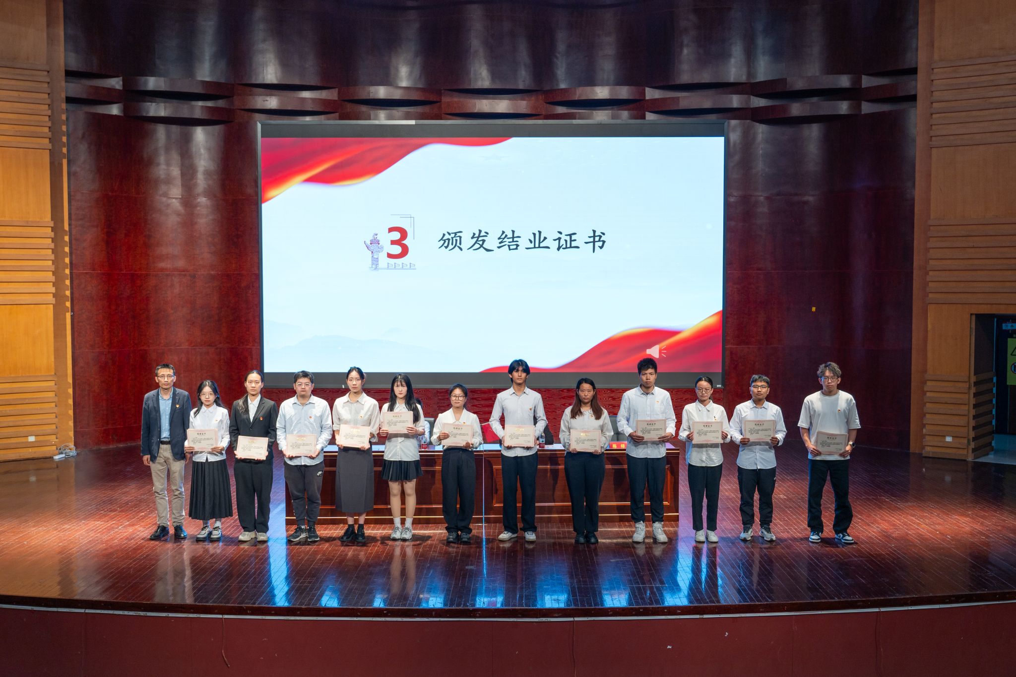 在庄严的国歌声中,本次结业典礼正式拉开帷幕。