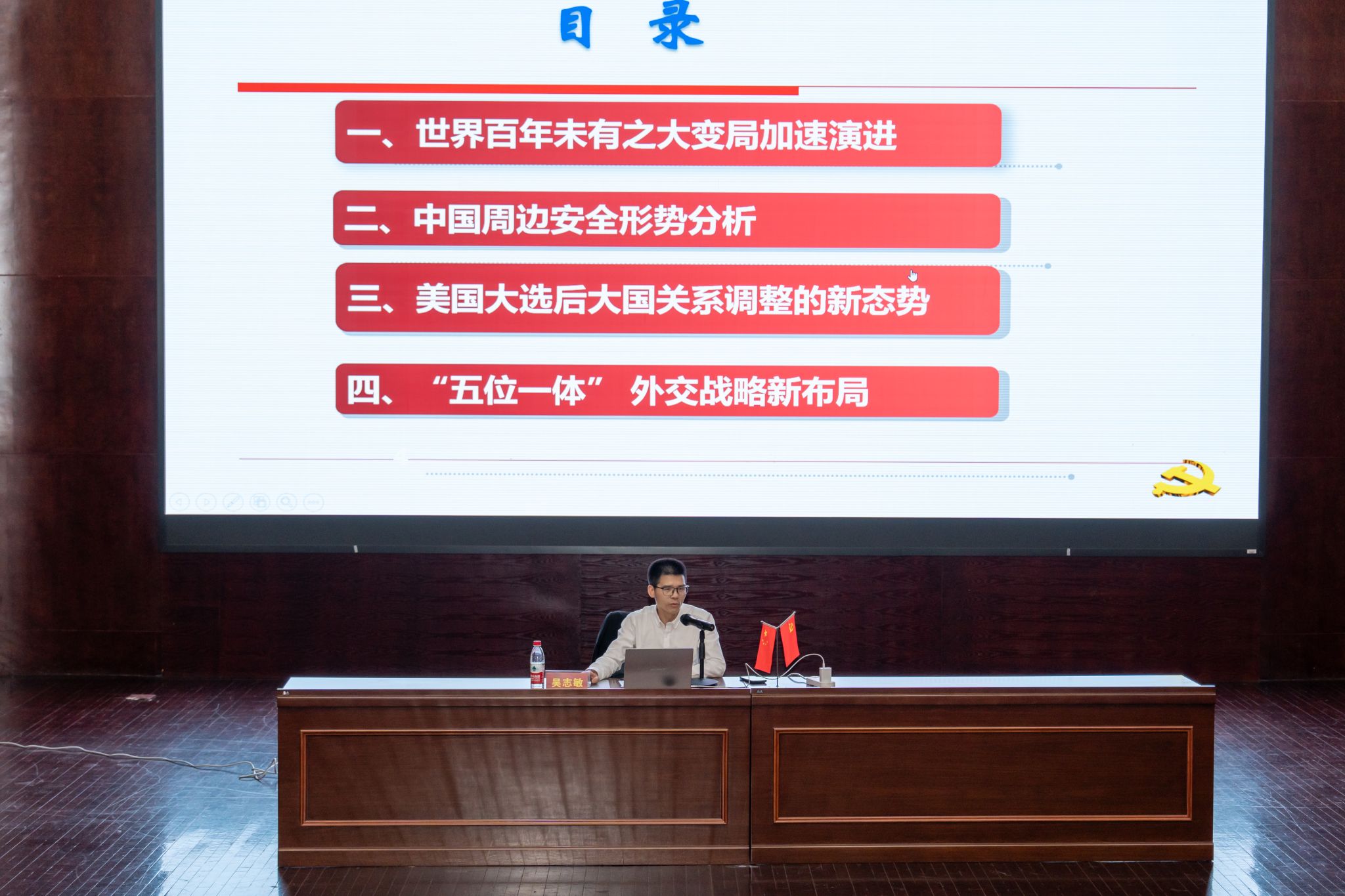 beat365英国官方网站教务处副处长吴志敏同志带来专题讲座第二讲:《当前国际形势与国家安全》。吴志敏教授结合自己多年的学术研究与实践积累,围绕世界百年未有之大变局加速演进、中国周边安全形势分析、美国大选后大国关系调整的新形势和“五位一体”外交战略新布局四个方面,聚焦当前国际形势中的热点,详细讲解了我国在国家安全方面所面临的国际国内形势。