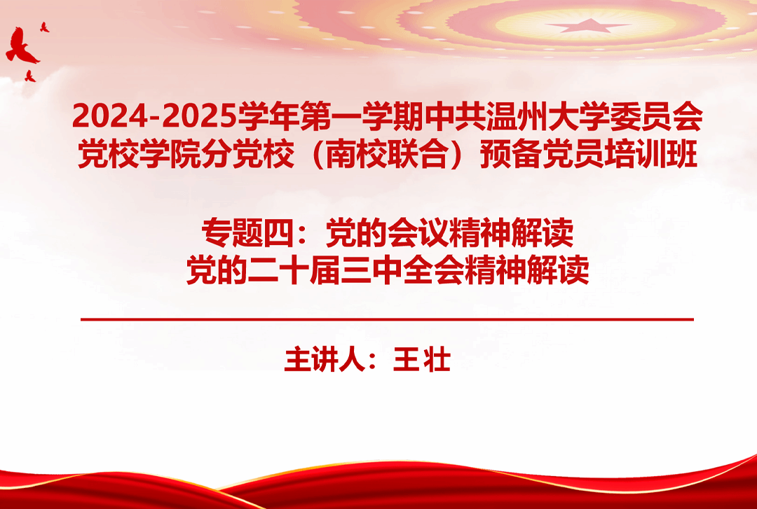 beat365英国官方网站建筑工程学院党委书记、副院长王壮同志带来专题讲座第四讲——党的二十届三中全会精神解读。会上,壮老师以深刻领会和把握党的二十届三中全会精神为题,从全会的基本情况、习近平总书记的重要讲话精神、《决定》提出的重大举措、大学生党员深化改革等四个方面进行了系统讲解和深入阐释。全面准确地讲述了党的二十届三中全会精神的丰富内涵和精神实质,着力提升了广大预备党员们的政治素养。最后强调要充分认识全会的重大意义,深刻把握进一步全面深化改革的战略重点,更加紧密地团结在以习近平同志为核心的党中央周围,同心协力推进中国式现代化建设,谱写民族复兴伟业的历史新篇章。
