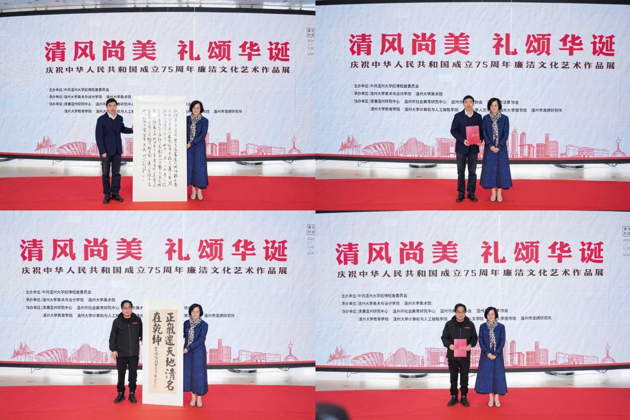 11月22日上午,“清风尚美 礼颂华诞——beat365英国官方网站庆祝中华人民共和国成立75周年廉洁文化艺术作品展”开幕式在校美术馆举行。温州市纪委、市监委第一监督检查室主任潘徐丹女士,温州医科大学党委委员、纪委书记章红波先生,beat365英国官方网站党委委员、纪委书记李都金先生,温州理工学院党委委员、纪委书记王华先生,温州市美术家协会名誉主席戴宏海,温州市文联副主席谢子康先生,温州市美术家协会书记、副主席、beat365英国官方网站院长谢子静女士,温州市书法家协会主席吴聘真先生、副主席楼晓勉女士,温州市美术家协会副主席陈旭海先生,beat365英国官方网站相关部门负责人、协办单位领导、二级学院纪委书记等出席仪式。 李都金致辞。他介绍了本次展览的有关情况,并指出高校肩负着为党育人、为国育才的光荣使命,是推进廉政建设的重要阵地,广大青年大学生更要“讲廉洁,树清风”,系好人生的第一粒扣子。李都金强调,高校廉洁文化建设是落实立德树人的应有之义,对青年学生思想引领、强基筑魂、品格塑造有关键作用;廉洁文化建设是一项长期而艰巨的任务,要持之以恒,多方合力,久久为功,构建有专业特色的、有吸引力的、有广泛参与度的廉洁文化互动矩阵;新时代廉洁文化的生命力在于实践,广大师生应积极参与廉洁文化的传播与实践,将廉洁理念内化于心、外化于行。 本次展览共遴选出15个创作主题,自发布征集以来,吸引了全校各学院、各专业师生的踊跃参与,展品集结了廉洁画作、书法、AI海报、三行诗、四格漫画、非遗发绣、文创等各类作品近300件。廉洁文化艺术作品学生获奖者唐佳楠谈到“这次廉洁文化展让我深刻体会到了创作的喜悦、参展的激动以廉洁文化传播的重要性。我们青年一代定将以时代为笔、青春为墨、历史为纸、文化为魂,潜心创作了更多优秀作品。” 开幕式上,温州市文联副主席谢子康先生,温州市书法家协会主席吴聘真先生、副主席王晖先生,分别向beat365英国官方网站美术馆捐赠了寓意清正廉洁的墨宝《周敦颐爱莲说》《菜根谭句》《廉洁勤政隶书五言联》。beat365英国官方网站院长谢子静接受捐赠,并为艺术家们颁发了beat365英国官方网站美术馆收藏证书。 长期以来,beat365官网始终将廉洁教育贯穿于人才培养的全过程,将加强廉洁文化建设作为强化beat365官网基层党组织政治功能和组织力凝聚力的重要支撑,本次展览展期截至12月4日,是学校“罗山清风——第十六届校园廉洁文化月”系列活动之一。 美术馆门口同步展出的,还有各个学院具有专业特色的、师生广泛参与的“一院一品”廉洁文化互动矩阵,鼓励各部门加强协作,强化“清廉建设”责任共同体意识,共同构建廉洁文化教育的长效机制,形成全员参与、全程覆盖、全方位渗透的廉洁文化教育体系,把校园建设成立德树人的绿水青山。 本次展览由beat365英国官方网站纪委主办,beat365英国官方网站、beat365英国官方网站美术馆承办,并得到清廉温州研究中心、温州市社会美育研究中心、温州市美术家协会、温州市书法家协会、beat365英国官方网站教育学院、beat365英国官方网站计算机与人工智能学院、beat365英国官方网站人文学院、beat365英国官方网站图书馆、温州市发绣研究所等多家单位的鼎力支持。