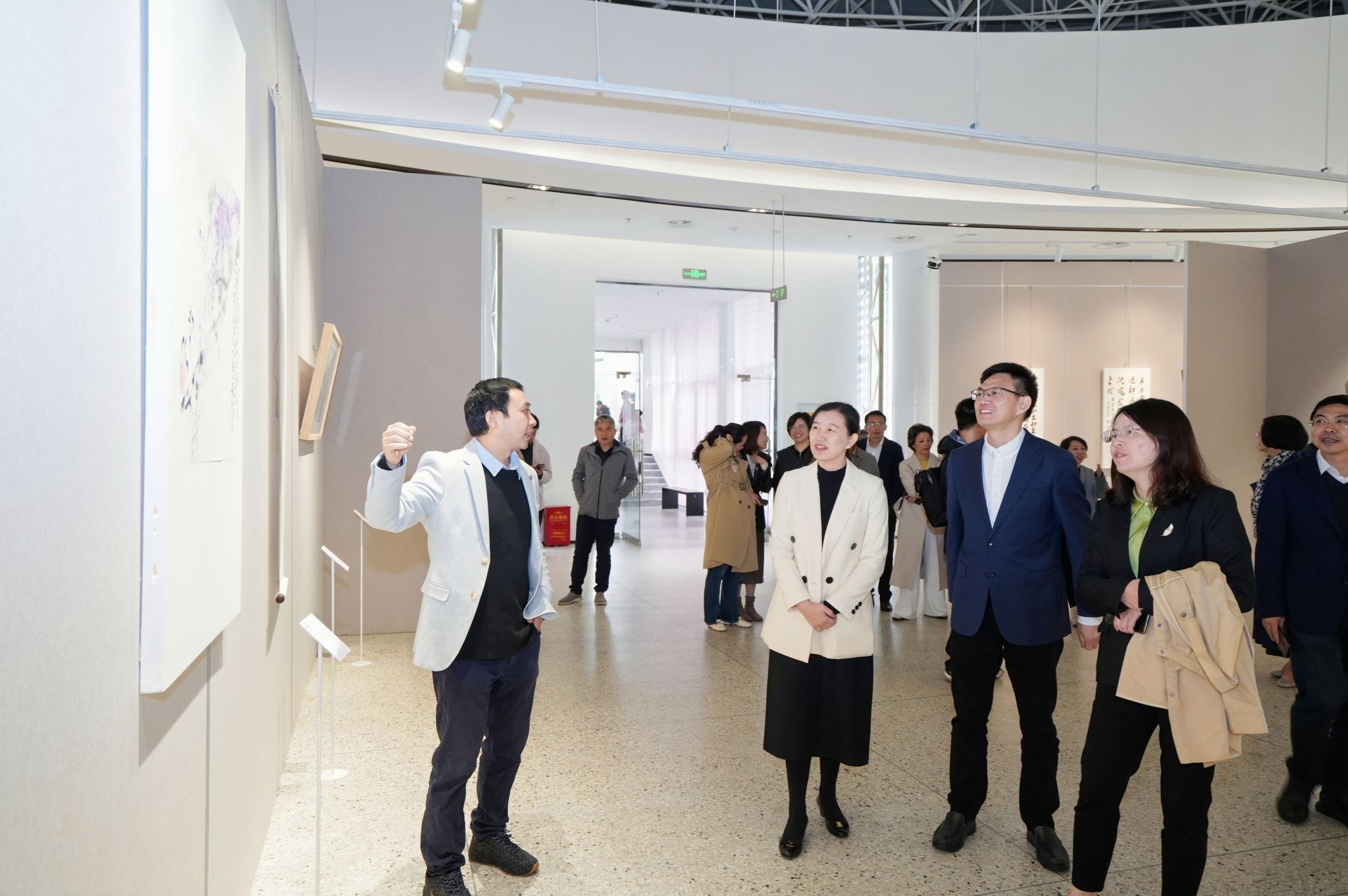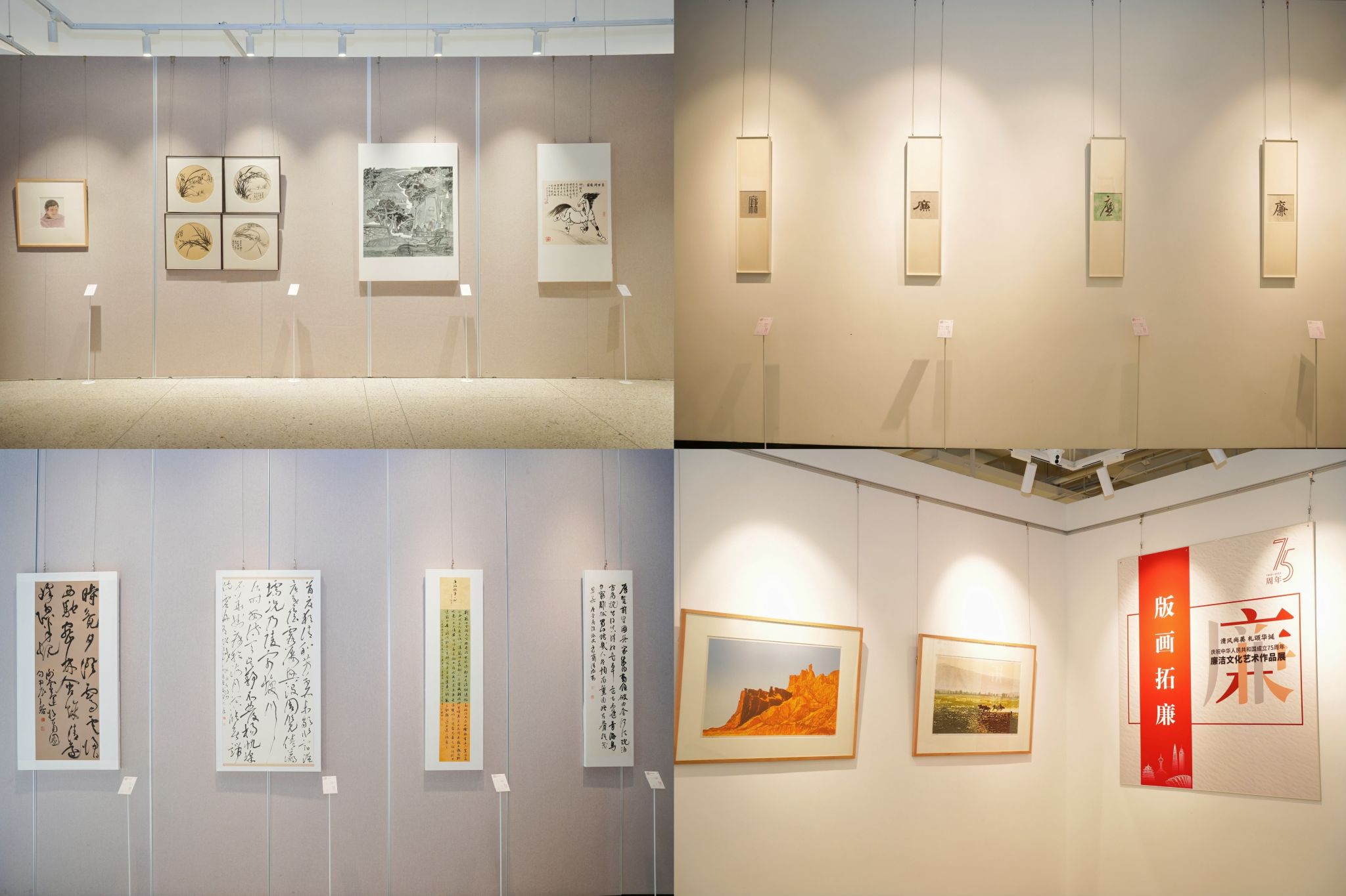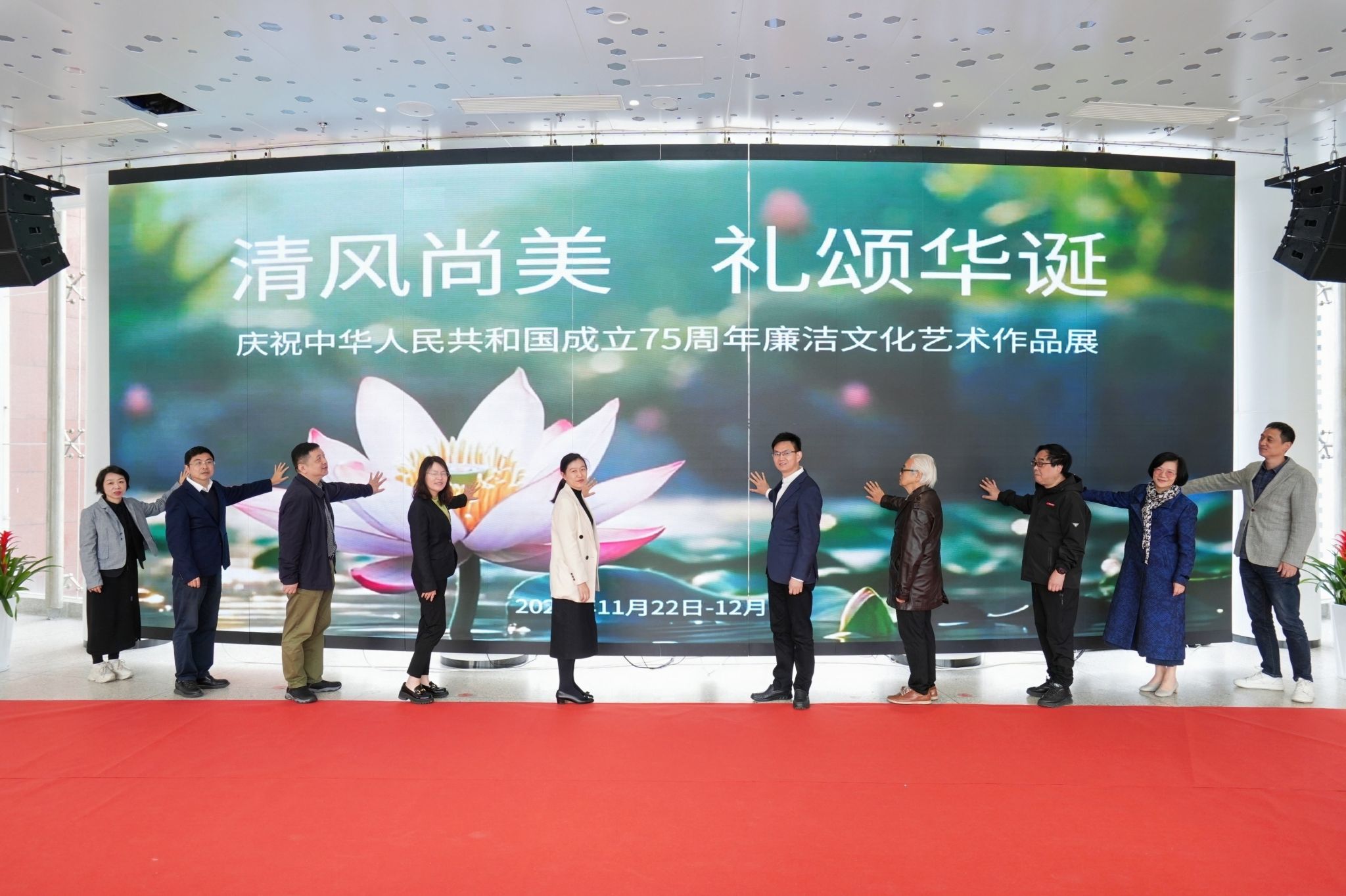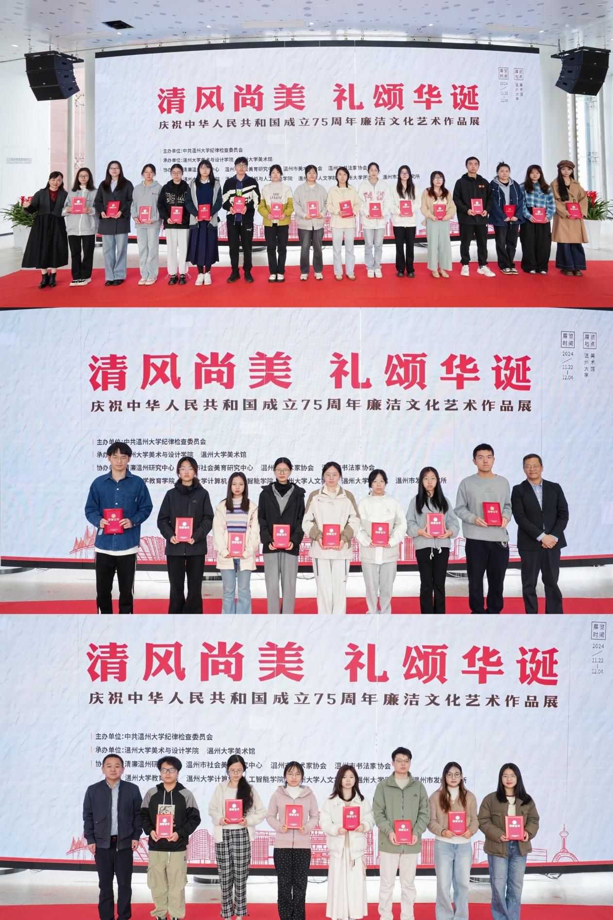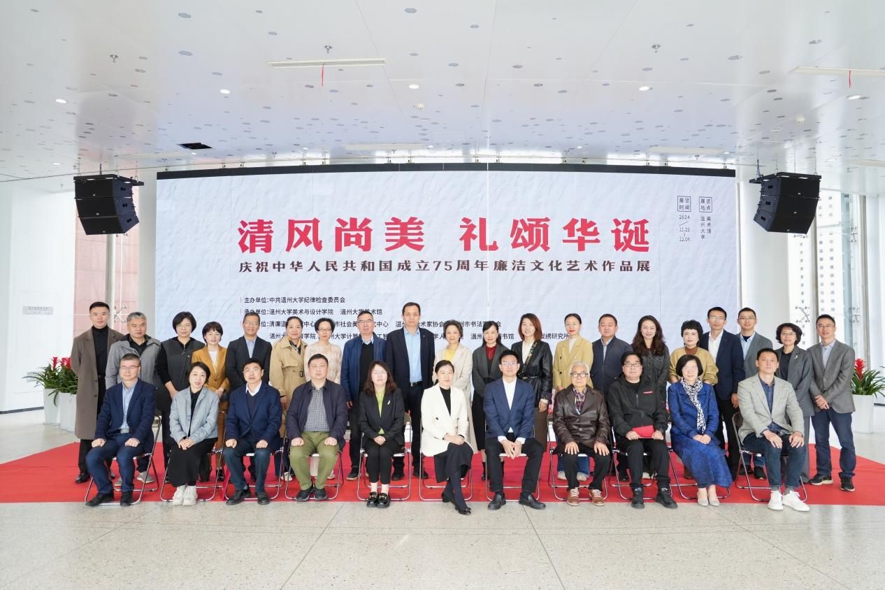 11月22日上午,“清风尚美 礼颂华诞——beat365英国官方网站庆祝中华人民共和国成立75周年廉洁文化艺术作品展”开幕式在校美术馆举行。温州市纪委、市监委第一监督检查室主任潘徐丹女士,温州医科大学党委委员、纪委书记章红波先生,beat365英国官方网站党委委员、纪委书记李都金先生,温州理工学院党委委员、纪委书记王华先生,温州市美术家协会名誉主席戴宏海,温州市文联副主席谢子康先生,温州市美术家协会书记、副主席、beat365英国官方网站院长谢子静女士,温州市书法家协会主席吴聘真先生、副主席楼晓勉女士,温州市美术家协会副主席陈旭海先生,beat365英国官方网站相关部门负责人、协办单位领导、二级学院纪委书记等出席仪式。