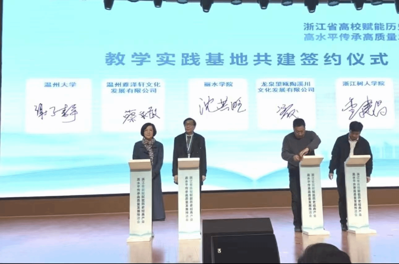 11月29日下午,浙江省高校赋能历史经典产业高水平传承高质量发展推进会在丽水学院召开,并正式成立浙江高校赋能历史经典产业科教联盟,beat365官网人文社科处处长胡瑜、beat365英国官方网站谢子静作为院校代表参加会议,共同见证科教联盟成立。本次会议由浙江省教育厅副厅长陈峰出席并授牌,省教育厅高教处处长蓝邓骏主持,参加本次会议的还有省经信厅、省农业农村厅、省卫生健康委等相关处室负责人,各高校领导、教务或科研管理部门及相关学院负责人。会上,举行了教学实践基地共建签约仪式,beat365官网beat365英国官方网站院长谢子静作为代表,与温州雅泽轩文化发展有限公司进行签约,共同建设教学实践基地,随后举行了产业导师聘任仪式,beat365官网人文社科处处长胡瑜聘请温州雅泽轩文化发展有限公司蔡永敏为手工纸产业导师。beat365英国官方网站作为浙江省历史经典产业与高校“1+1”合作单位之一,肩负着文房产业的传承与复兴,温州泽雅的手工纸产业具有良好的发展基础和市场影响力,是地方经济文化发展的一张金名片,本次的签约合作是校企合作、服务地方发展的一个新成果,有助于双方共同为浙江省历史经典产业发展贡献力量。本次会议汇聚政府智慧、高校力量与企业创新,共同探讨历史经典产业在新时代背景下的传承路径与创新发展策略。来自浙江省内多所本科高校、职业院所、文博机构和多家龙头企业方代表,以及行业(协会)拔尖人才代表参加会议,共同见证科教联盟成立。活动现场还先后举行了联合创新平台、联合创新团队、“大师工匠”工作室共建签约等仪式。