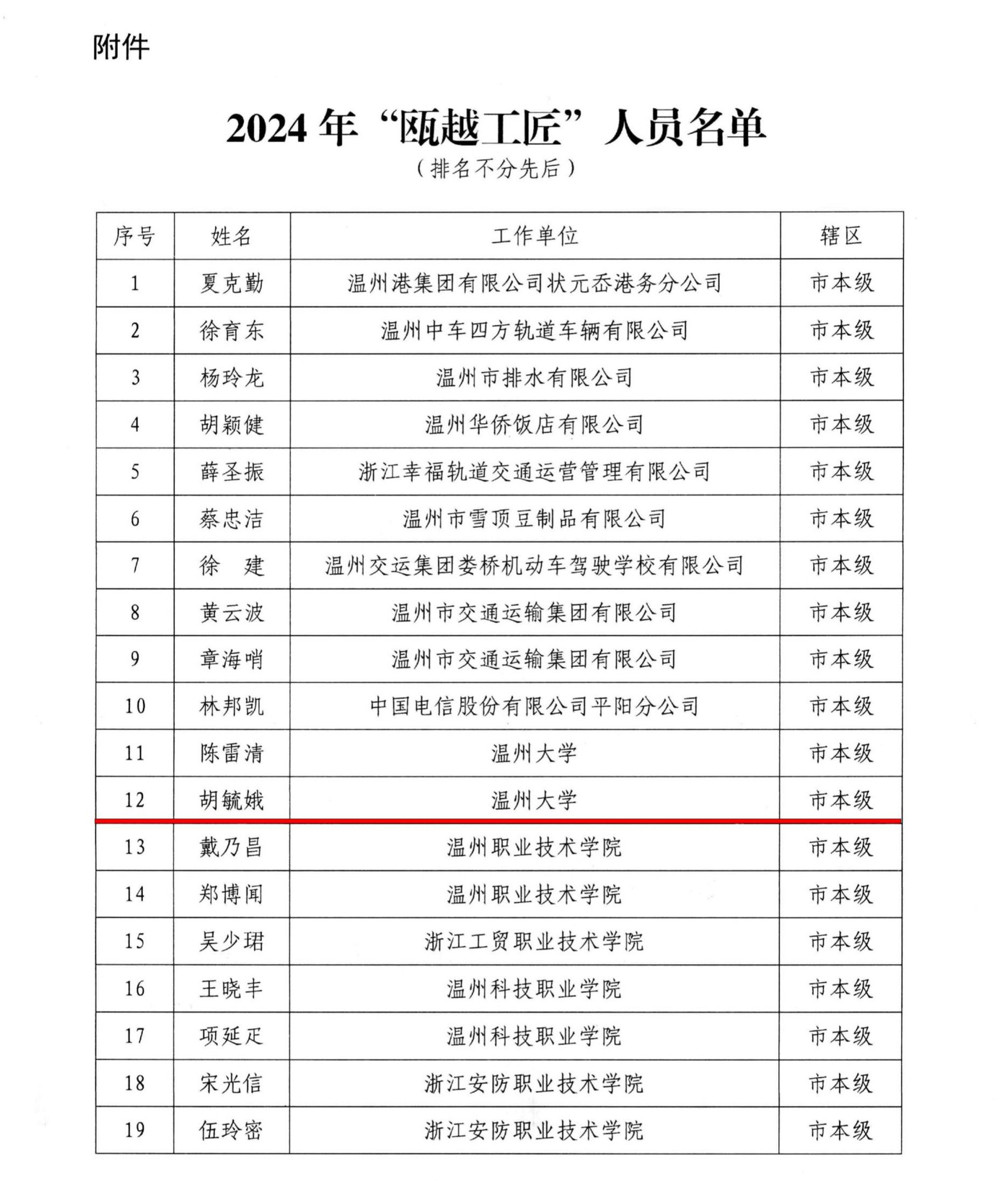 另外,温州市人力资源和社会保障局公布了2024年“瓯越英才计划-瓯越工匠”人员名单,beat365官网胡毓娥老师榜上有名。