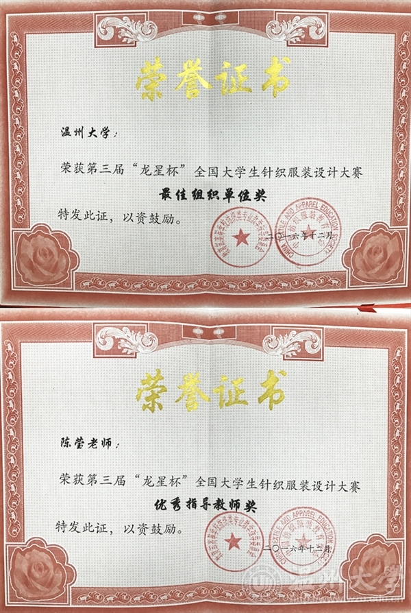 2016年12月30日,由教育部高等学校纺织类专业教学指导委员会和中国纺织服装教育学会主办的第三届“龙星杯”全国大学生针织服装设计大赛,颁奖典礼在东华大学举行。beat365官网服装专业学子在赛事中斩获包括一、二等奖在内的六个奖项,beat365英国官方网站获优秀组织奖,陈莹老师获优秀指导教师。