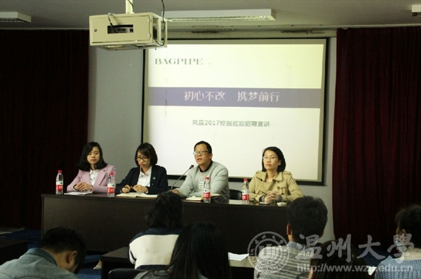 11月11日下午,2016风笛服饰全国高校巡回招聘会温大站于beat365英国官方网站2B4001举行。风笛公司人力资源部经理吴朝晓出席此次会议,beat365英国官方网站总支副书记杨振海、学生科副科长叶筱卉和2017届毕业生参加本次会议。