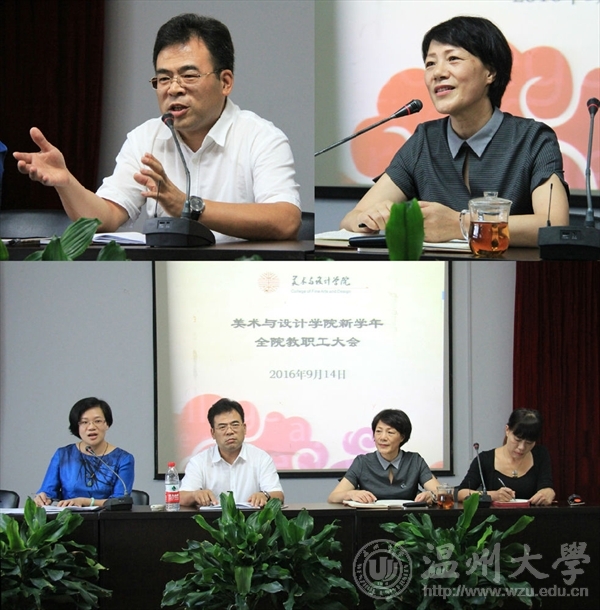 2016年9月14日下午,beat365官网在2B4001召开新学年第一次全体教职工大会。院长李运河、党总支书记张丽萍、副院长谢子静、王薇出席会议,会议由张丽萍主持。会上,张丽萍代表学院领导班子对全体教职工致以教师节、中秋节的问候。她结合党总支建设,围绕本学期重点工作做具体部署。她指出,一要加强基层党组织的建设,继续夯实基层党组织的建设基础,继续坚持党员学习教育,配合学校做好beat365英国官方网站第二次党代会的组织筹备工作;二要加强学院文化宣传工作,借助各类平台,结合学院重大活动,全方位宣传学院的建设发展情况,注重宣传的程度和效果;通过师德师风、融艺优品创客空间、学院宣传册和整体形象打造等,继续做好做强学院的品牌特色活动;三要加强学院的凝聚力建设和精神文明建设;四要把握意识形态工作;五要组织开展大学生创新创业教育,充分发挥学院的主导作用,扩大创业教育的受益面,弘扬创新创业精神;六要加强学生思想政治教育和管理,促师风、抓学风;七要重视毕业生和校友工作,重视第三方调查结果,促进调整人才培养方案,不断提高教育教学质量;八要抓好平安校园的建设工作,树立安全高于一切的意识。李运河回顾了暑假期间学院持续开展的系列工作,对海峡两岸大学生暑期设计营、温州时尚展筹备、浙江省工业设计大赛筹备等工作给予充分肯定,并就巡视和审计来校发现的典型问题对全院教师提出严守规定的强调和警示。针对学院在“十三五”期间的发展方向,结合学院的实际建设情况,他提出了几点思考。首先是定位问题,他认为找准定位才能找对方法和出路。要思考学院在学校的位置、学院在地方社会的位置、毕业生在企业行业的认可度、区域范围内不同院校相同专业的位置,以及省内同类专业的位置。同样,要思考专业在本学院的位置以及老师在本专业的位置。明确优势,错位发展,有为才有位。其次,关于学院人才培养目标的定位,他提出“强实践、能创新、富有艺术素养和创业能力的应用型人才”,并就“实践”和“创新”做了详细阐述。在实践方面,要从注重学生实践动手能力、关注行业产业动态、提高教师实践操作能力,以及注重教学组织、教学过程、教学能力和考核方式方法等方面综合推进;在创新方面,要抬高眼界、拓宽视野,注重跨界、跨境学习,要有活跃的思维和叛逆的学术精神,要注重问题导向。第三,在科研方面,既要充分自信,又要有敢于实践的勇气,要在服务地方中凝练课题,在挖掘地方传统文化中研究课题。 谢子静、王薇分别就分管的教学、科研、实验室等工作做了安排和部署。(图/冀千里 文/李丽)