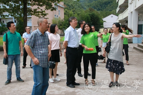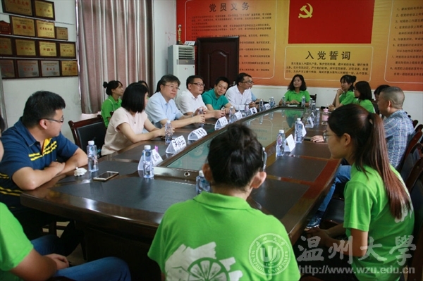 7月17日上午,beat365英国官方网站校长李校堃、党校办主任王定福、校团委书记屠霁霞、校团委副书记熊琳一行在beat365官网党总支副书记杨振海、学生科副科长叶筱卉的陪同下来到文成县大峃镇樟台乡希望小学,对正在这里开展暑期社会实践的“绘暖向南”大学生暑期社会实践队进行了慰问。
