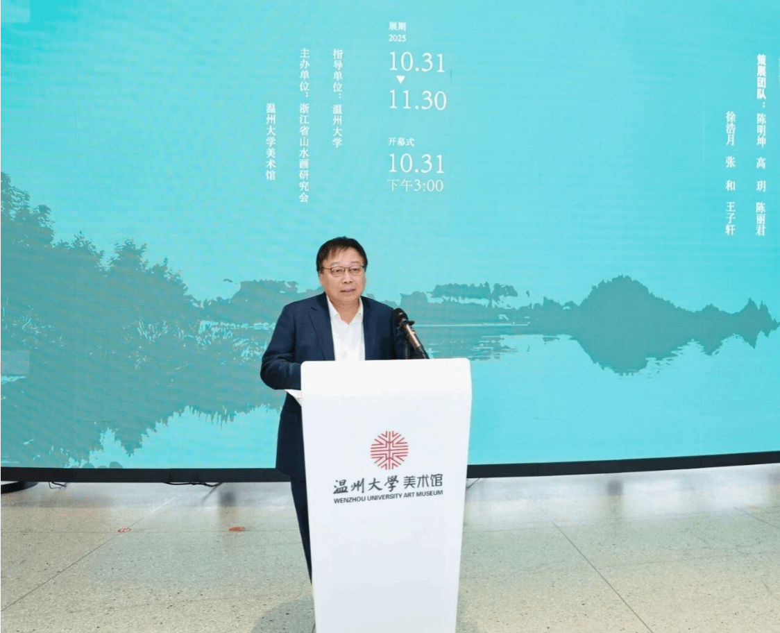 beat365英国官方网站校长赵敏在致辞中表示,此次展览落地beat365英国官方网站美术馆,既是对学校美育工作的肯定,更是高校与文化社团携手传承优秀传统文化的生动实践,为师生提供了亲近高端山水艺术的宝贵契机。他指出,楠溪江不仅凝聚着浙南山水的灵秀记忆,更是承载浙南千年文脉的重要载体。昔时谢灵运于此开创中国山水诗风,山水画亦由此发脉。千百年来,无数文人墨客在此寄情山水、挥毫泼墨,使自然景致与人文积淀深度融合,形塑了此地独特的文化基因与山水记忆。赵敏校长进一步强调,高校应在美育推广与文化传承中发挥引领作用,并充分肯定了我单位在此领域所取得的积极建树。最后,他表达了对传统艺术在当代社会焕发新活力、拥抱更光明未来的诚挚祝愿。