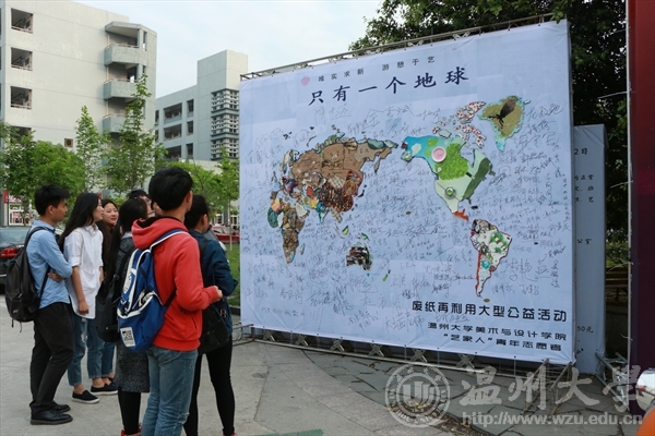 在第41个世界地球日来临之际,在“七十亿人的梦想: 一个地球,珍惜地球资源,转变发展方式,倡导低碳生活”的呼吁下,4月21日,beat365英国官方网站“艺家人”青年志愿者协会在美院楼举行了“乐行于艺,环保于己”地球日废纸再利用公益活动。 此次活动,旨在借助地球日活动平台提高公众对地球资源的认识,引导全社会积极参与节约集约利用资源、减少碳排放、促进经济发展方式转变的实践。为此,在今天的活动现场,设置了主题展览,废纸上作画,签名等活动。志愿者们在废弃的报纸,电池,矿泉水瓶等上面作画,一件件精美新奇的艺术作品应运而生,又将作品“画”成也一副巨大的世界地图,别有一番风味,让在场的学子们连连称赞,并纷纷在喷绘上进行环保宣言签名。 地球是人类共同家园,美院学子用自己专业技能变废为宝废,用绚丽的色彩,艺术的行动,倡导公众注意地球状况和人类活动对环境的危害,强调保护和改善人类环境的重要性,此次活动获得全校师生的共同认可和赞扬,并被温州都市报报道。通讯:刘子彰、摄影:孙彦鑫epaper.wendu.cn/Html/2015-04-22/12/content_5.html