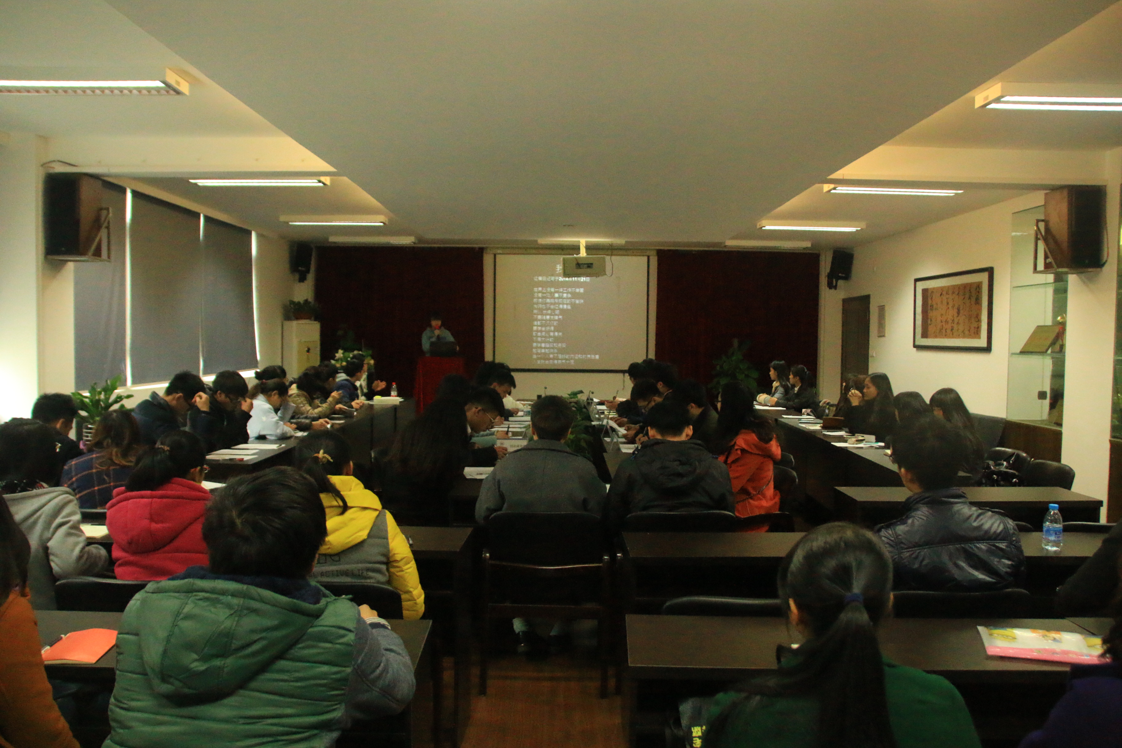 1月7日下午,beat365英国官方网站团委学生会在2B4001召开本学期第四次全委会暨“星级部门”、“每月之星”的评比。参加此次会议人员有学院团委书记叶如芳,辅导员杜茜、陈赛慧,研究生学姐李艳燕,团委副书记金李斌、学生会主席吴荣婷、学生会副主席叶佳颖、冯瑜瑜以及各部门部长与干事们。