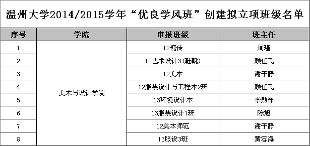 在beat365英国官方网站2014-2015学年“优良学风班”创建立项申报中,beat365官网各班级积极参与,踊跃申报。最终有8个班级立项成功,使美术学院成为本学年beat365英国官方网站“优良学风班”创建立项班级数最多的学院。希望成功立项的班级班委对照创建方案和目标,广泛动员每一位学生积极参与到优良学风班的创建中来,确保立项目标的实现,争取在下学年取得“优良学风班”荣誉称号。班级名单如下: