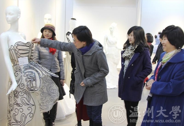 2015年1月12日下午,beat365英国官方网站院长李运河、副院长蔡可群、党委书记郑彩莲、副书记杨振海、院办公室主任李丽、服装系主任陈明艳等一行人,莅临“衣彩纷呈”课程联展现场参观指导,为此次课程联展拉开了序幕。 《礼服设计与立体造型》《服装面料再造》课程联展,以“衣彩纷呈”的主题,以“培养学生创新创意思维,提高综合应用所学的专业知识,激发学生学习活力”为宗旨。通过礼服、创意装、面料二次创意等设计作品的汇报展出,强化学生的实际动手能力,反应课程改革的成果,并给学生提供了自我展示的平台和互相交流学习的机会。本次展览由11级艺术服装2班24名同学的作品组成。参展的礼服习作共计20件(套),创意装设计24件;面料二次创意设计46件。礼服设计突出艺术手法运用与效果表达,注重品质与流行元素的运用,同时注重搭配与材料的创意创新,强调手工制品的艺术表现手法和多元融合化;面料再造设计以原始面料为出发点,以激发学生无止尽的想象与创造能力为培养目的,强调面料二次设计手法与面料材质的适应性,旨在创作出与时尚接轨并引领潮流的面料创意产品。这些作品反应了学生学习与劳动的成果,也是魏静、陈莹、叶婷三位指导教师细心指导的结晶。