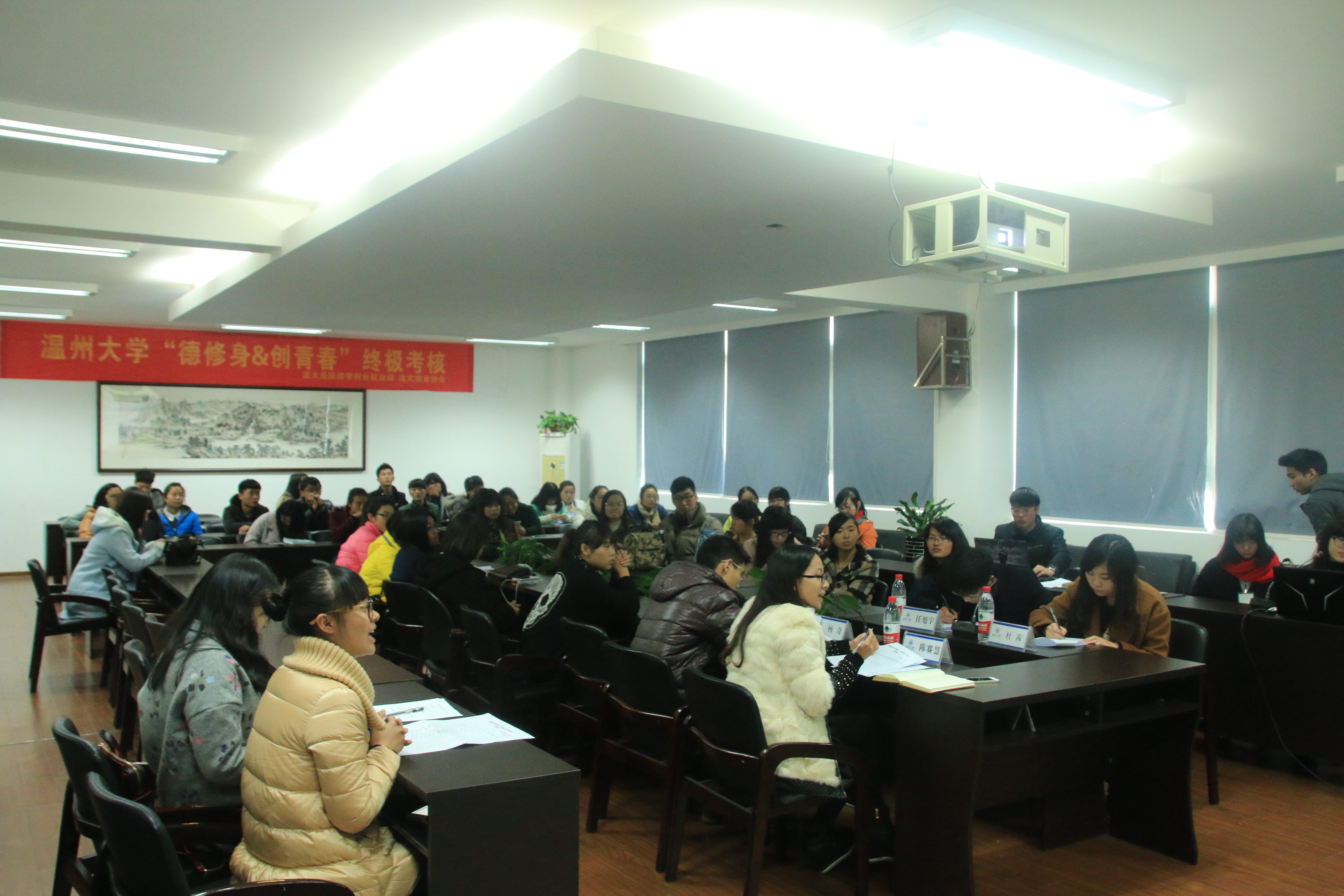 2014年12月24日下午,由beat365官网团学创业就业部和温大创业协会联办的为期半年的“德修身&创青春”创业就业系列培训活动于美院2B4001会议室,圆满地落下了帷幕。出席本次终极考核的嘉宾有beat365官网学生科辅导员杜茜老师、陈赛慧老师、温州仟度品牌设计有限公司负责人任旭宇先生和商学院研究生杨奇学长担任评委。来自校本部、城市学院和瓯江学院的学生们都积极参加了本次终极考核。