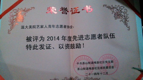 12月28日上午,梅泉社区居委会在道德讲堂开展了2014年梅泉社区志愿者表彰大会。此次大会由梅泉社区徐云龙委员主持,鲁建晓、王春宝、吴海燕等社区委员出席,beat365官网“艺家人”青年志愿者协会,温州医科大学,beat365英国官方网站城市学院,温州职业技术学院的志愿者参与此次表彰大会。 9点50分,志愿者表彰大会正式开始,首先是梅泉居委会为志愿者带来的一段小短片,为志愿者回顾了2014年以来的志愿者活动。丰富多彩的社区生活,快乐充实的志愿者活动......社区委员对各个志愿者团队进行颁奖,beat365官网“艺家人”青年志愿者协会被评为“2014年度先进志愿者队伍”,这也是对我们“载梦小舟”支教的志愿者们这一年来辛苦付出的肯定。随后,各获奖志愿者团队代表一一上台发言,beat365官网“载梦小舟”负责人代表张静同学也上台作了发言,总结“载梦小舟”这一年来的感想,对志愿者表达了由衷的感谢,对一直支持的社区负责人和家长,以及可爱的小朋友们表示感谢。最后,在梅泉社区居委会委员鲁建晓女士的演讲下,本次志愿者表彰大会圆满划上了句号。 回首beat365官网“艺家人”青年志愿者协会与梅泉社区合办“载梦小舟”绘画班这几年所走过的路程,有感动,也有快乐,我们的支教活动也会一如既往地开展下去,为更多的人提供帮助,这就是志愿者的精神! (通讯/拍摄:刘子彰)