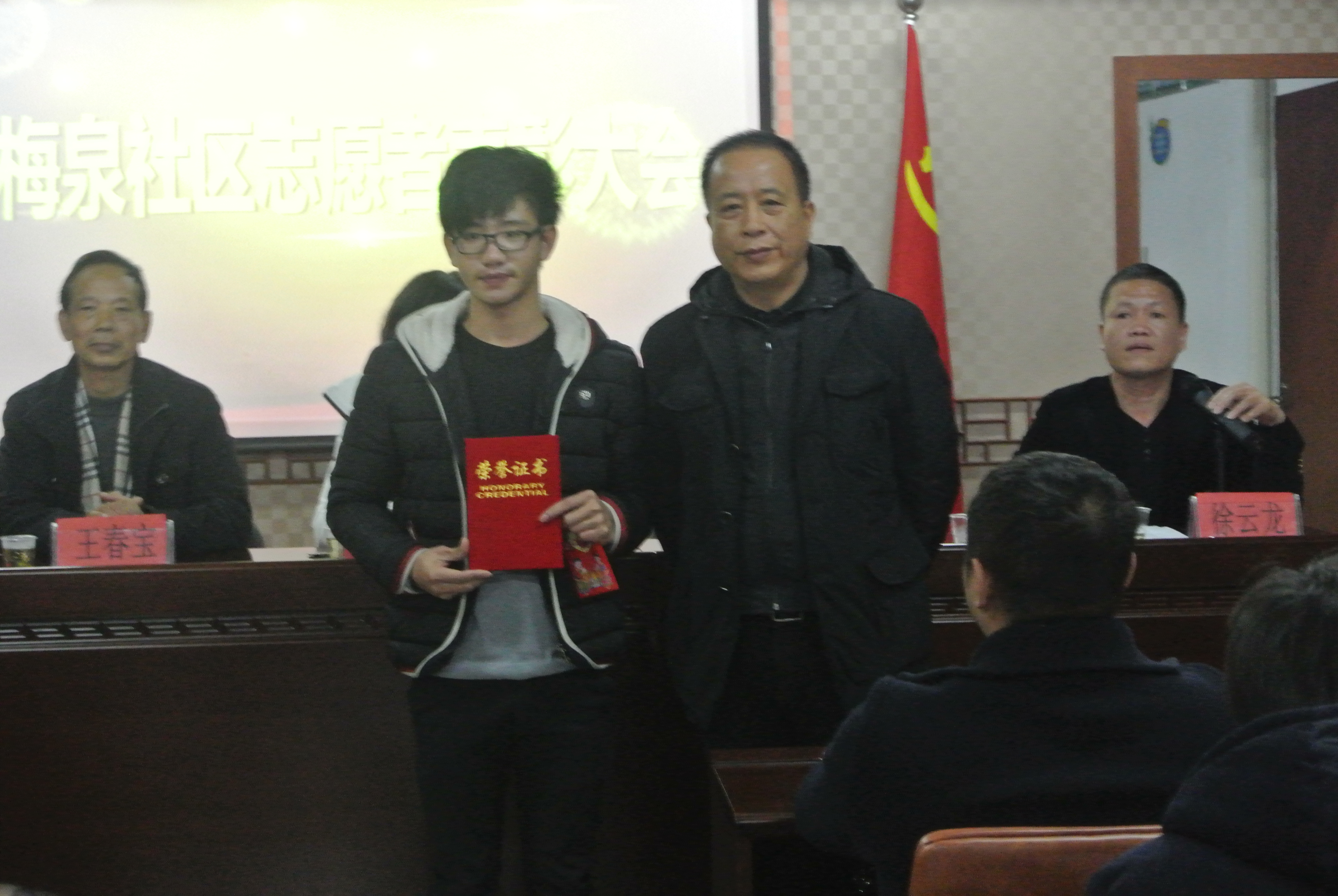 12月28日上午,梅泉社区居委会在道德讲堂开展了2014年梅泉社区志愿者表彰大会。此次大会由梅泉社区徐云龙委员主持,鲁建晓、王春宝、吴海燕等社区委员出席,beat365官网“艺家人”青年志愿者协会,温州医科大学,beat365英国官方网站城市学院,温州职业技术学院的志愿者参与此次表彰大会。