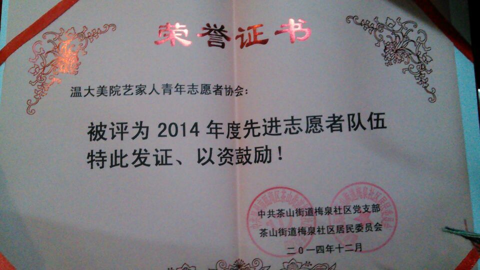 12月28日上午,梅泉社区居委会在道德讲堂开展了2014年梅泉社区志愿者表彰大会。此次大会由梅泉社区徐云龙委员主持,鲁建晓、王春宝、吴海燕等社区委员出席,beat365官网“艺家人”青年志愿者协会,温州医科大学,beat365英国官方网站城市学院,温州职业技术学院的志愿者参与此次表彰大会。 9点50分,志愿者表彰大会正式开始,首先是梅泉居委会为志愿者带来的一段小短片,为志愿者回顾了2014年以来的志愿者活动。丰富多彩的社区生活,快乐充实的志愿者活动......社区委员对各个志愿者团队进行颁奖,beat365官网“艺家人”青年志愿者协会被评为“2014年度先进志愿者队伍”,这也是对我们“载梦小舟”支教的志愿者们这一年来辛苦付出的肯定。随后,各获奖志愿者团队代表一一上台发言,beat365官网“载梦小舟”负责人代表张静同学也上台作了发言,总结“载梦小舟”这一年来的感想,对志愿者表达了由衷的感谢,对一直支持的社区负责人和家长,以及可爱的小朋友们表示感谢。最后,在梅泉社区居委会委员鲁建晓女士的演讲下,本次志愿者表彰大会圆满划上了句号。 回首beat365官网 “艺家人”青年志愿者协会与梅泉社区合办“载梦小舟”绘画班这几年所走过的路程,有感动,也有快乐,我们的支教活动也会一如既往地开展下去,为更多的人提供帮助,这就是志愿者的精神!(通讯/拍摄:刘子彰)