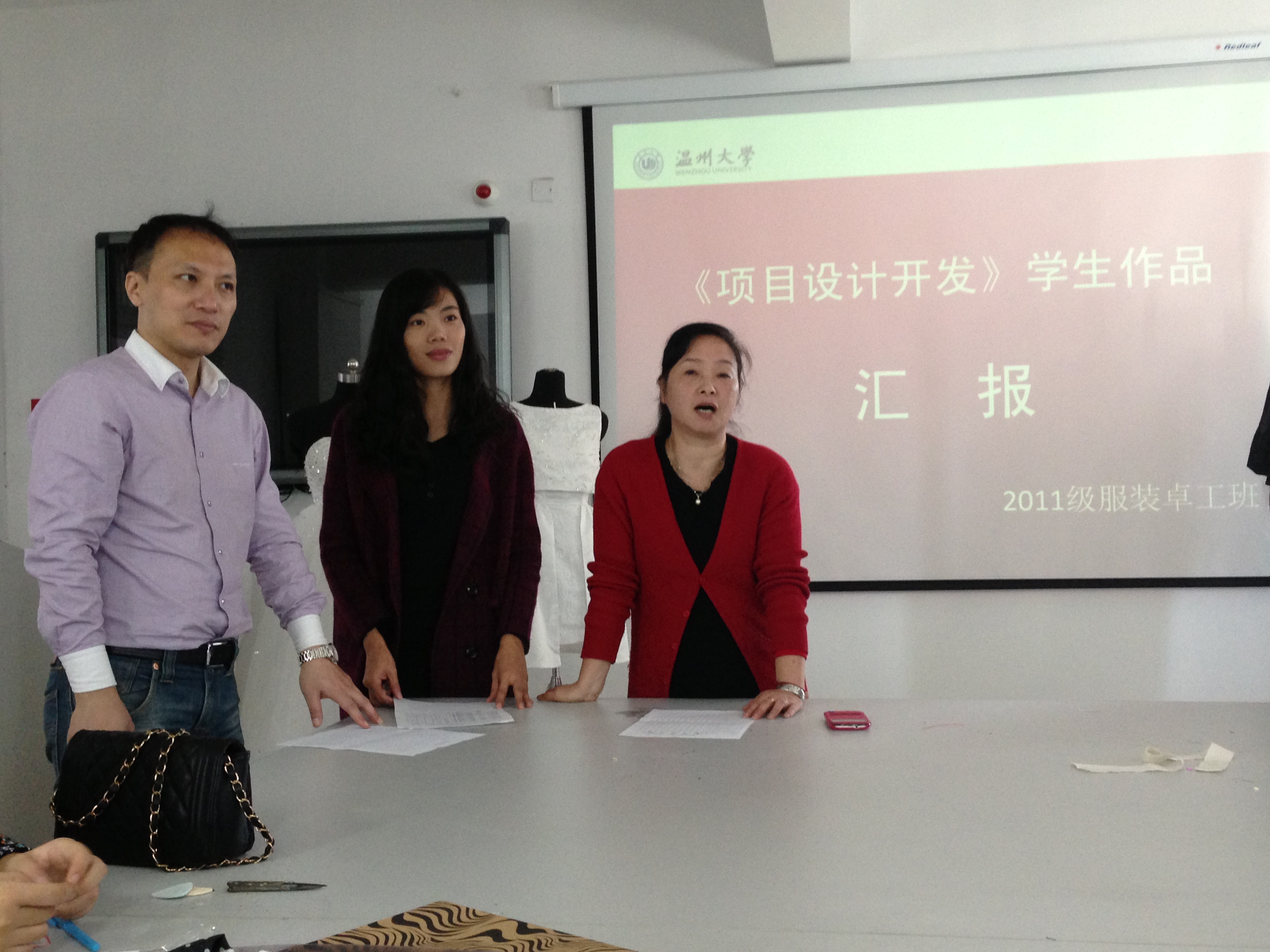 2014年11月28日,2011级服装设计与工程“卓越”班的《项目设计开发》实践课的学生作品汇报会在服装楼2A409教室举行。任课教师陈明艳、陈莹、朱江晖三位老师认真听取了同学们对于作品设计开发的构思理念、款式设计、结构样板设计、工艺制作等环节的阐述,并一一做了点评及评分。 《项目设计开发》是专门为实施卓越计划而量身打造的校内实践课程,其内容综合了服装材料、服装款式设计、服装结构设计、服装工艺、服装工业样板等多项课程的专业知识。通过这些知识的综合运用完成服装系列产品设计开发,使学生掌握设计开发的具体环节与要求,理解服装设计开发实施的流程。在此基础上,培养学生的市场意识、工程意识、创新思维以及综合实践能力,具备独立完成系列产品开发的构思、设计、打板、工艺等综合实践能力,为提前适应企业工作状态打下良好的基础。因此,综合性、实战性、创新性是这门课程的主要特点,对于衔接校内学习与校外实践具有承上启下的重要作用。 该课程在教学方法上采用项目式教学,以项目设计为导向,核心课程为基础,通过主题设计、样板制作、产品加工等流程的有机衔接,最终完成完整的实践项目。它最大的特点是在项目的策划、设计、实施的整个过程中,充分调动学生的主观能动性、创造性,提高学生发现问题、分析问题与解决问题的综合能力。 在传统服装设计与工程专业的校内实践教学的基础上,本实践课引入了项目综合实践模式,为更好地实施卓越计划、形成以项目实践为途径的实践教学模式做了有益的探索与尝试。