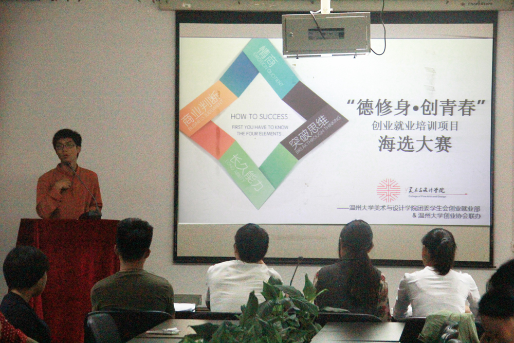 10月18日下午,beat365官网团委学生会创业就业部和校创业学院创业协会联办的“德修身&创青春”创业就业培训项目的海选大赛在2B4001拉开序幕。团委副书记金李斌,创业就业部副部长张昇、胡霜霜,研究生代表李艳燕、张娜,共同担任了此次大赛的评委。来自学校不同年级的同学参加了本次海选。 参赛选手热忱地讲出了内心关于创业的想法,并积极与评委或参赛同学进行交流。有的人已有创业经验,有的人怀揣着未实践的“创业梦”。评委们与各位参赛选手密切的交流,分享了自己创业的经验,并且提供建设性的意见。 希望通过德修身&创青春”创业就业系列培训项目可以激发在校大学生的创业活力与激情,增强创业就业能力,在创业路上迈出坚实的步伐。
