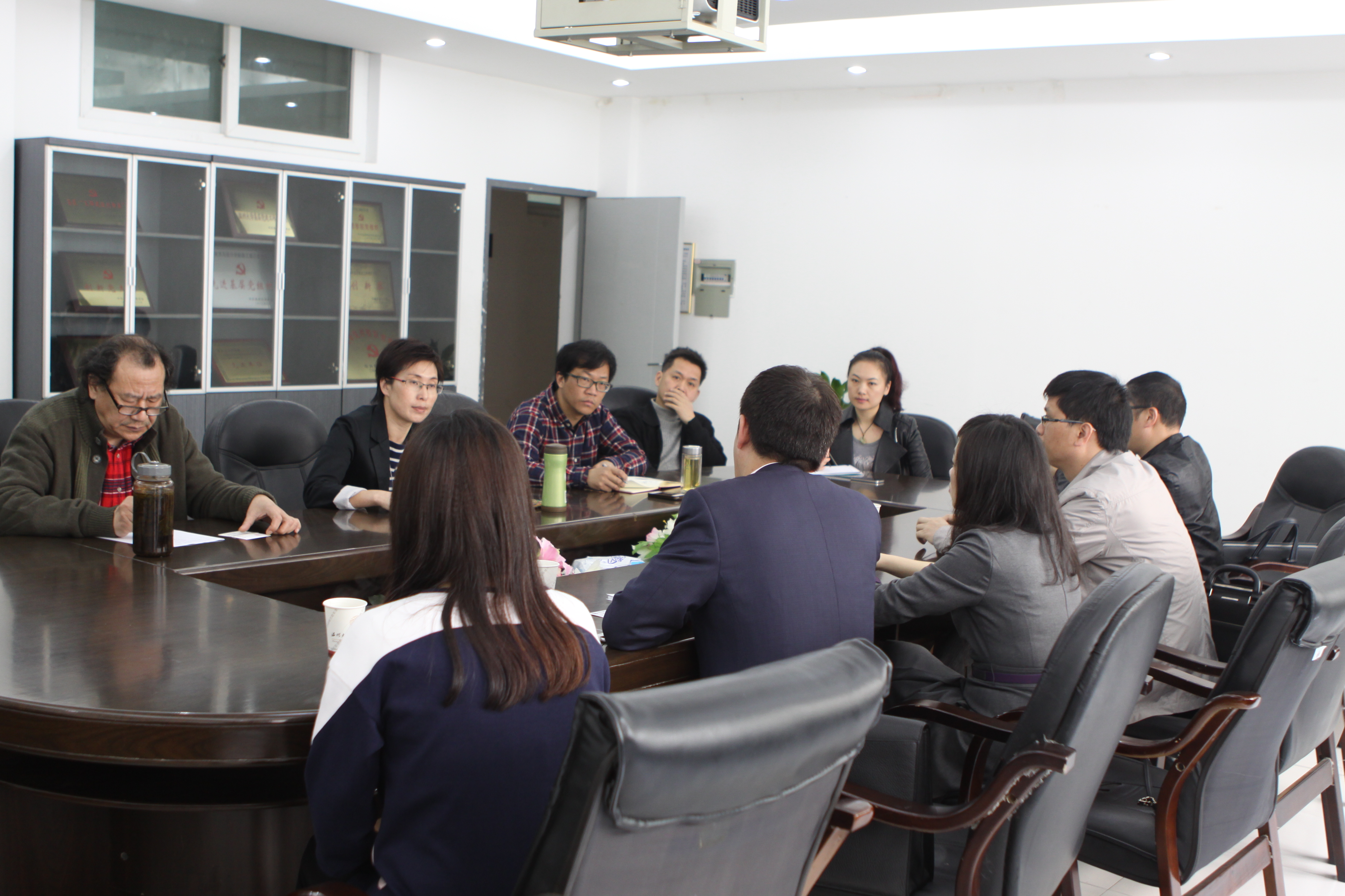 3月26日上午,在温州市招商局、市文化产业处等相关负责人的带领下,广东浙商投资股份有限公司董事长吴嘉胜一行来访beat365官网,就校企合作事宜做专题沟通。学院党总支书记郑彩莲、副书记杨振海出席会议,设计系主任朱广宇,视觉传达教研室主任刘俊,以及相关设计类教师参加了座谈会。