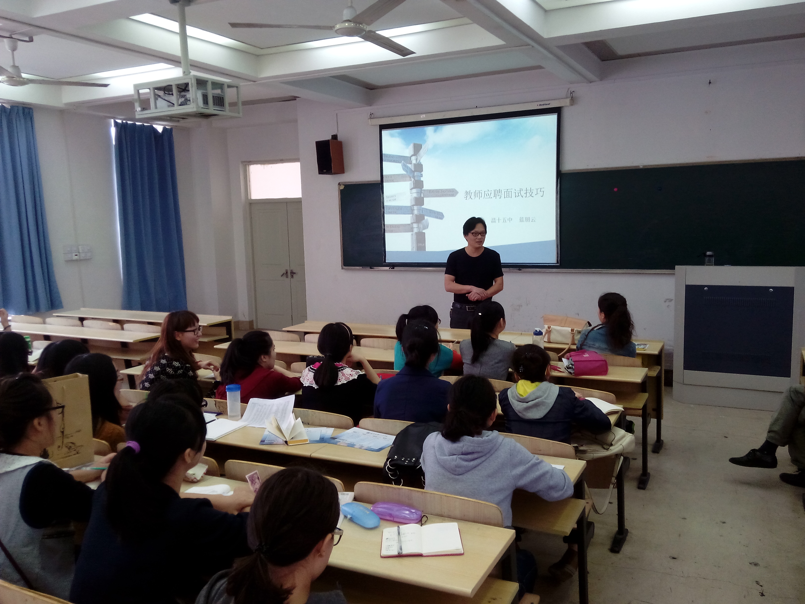优秀的面试是成功的敲门砖,为培养在校美术师范生的应聘技巧,11月6日下午一点半,温州市十五中美术教师蓝鹏云老师和龙湾二小美术教师包新新老师在3A-201为同学们做了《美术教师应聘技巧座谈》专题讲座,主持此次讲座的是beat365官网研究生办公室主任胡建南老师。