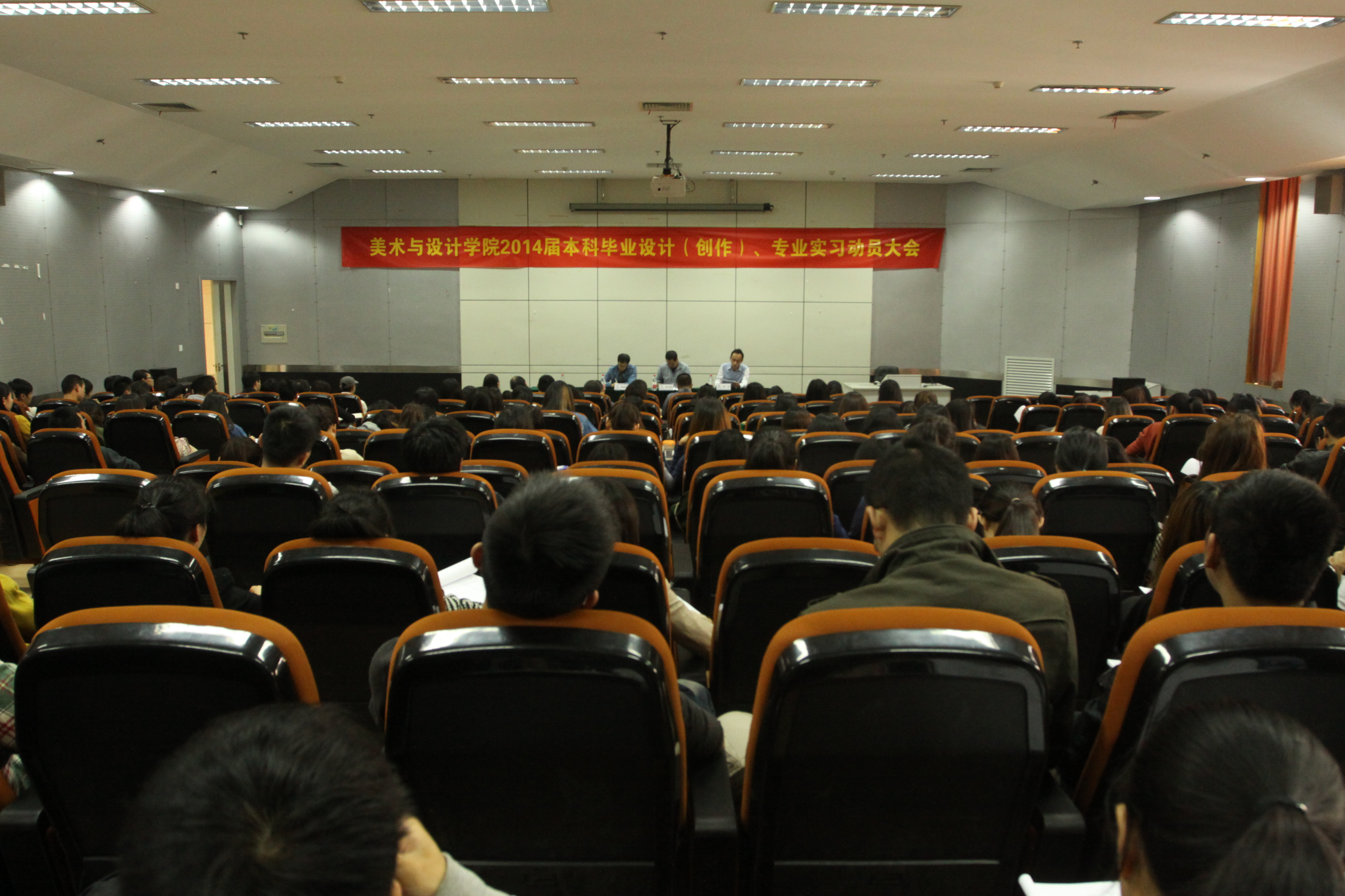为顺利开展2014届毕业设计工作,11月8日上午,beat365英国官方网站2014届本科毕业设计(创作)、专业实习动员大会在学校会展中心叶适厅举行。学院副院长蔡可群老师,副书记杨振海老师,教学科邹青老师,及美术、设计、服装三个系的系主任、各位毕业设计指导老师及全体14届本科毕业生参加了会议,会议由邹青老师主持。