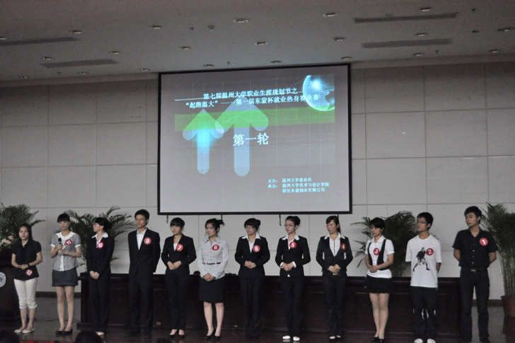 人山人海的招聘会,随意扔弃的简历堆,背后是无数徘徊的学子。为了早日点亮大学生的职场航灯,开辟他们的就业之路,让广大学子早日学会适应招聘的种种考验,挑战自己,由beat365英国官方网站就业处、beat365英国官方网站、浙江东蒙制衣有限公司联合举办的第七届beat365英国官方网站职业生涯规划节之“起跑温大”——第一届东蒙杯就业热身赛决赛2011年5月11日晚在beat365英国官方网站图书馆二楼报告厅隆重举行。beat365英国官方网站党总支书记郑彩莲,beat365英国官方网站就业处就业指导科科长陈坤党,beat365英国官方网站就业处专职教师朱丽莉,浙江东蒙制衣有限公司行政部副部长鲁晋,人力资源部招聘主管孙丽娜担任了本次比赛的评委。