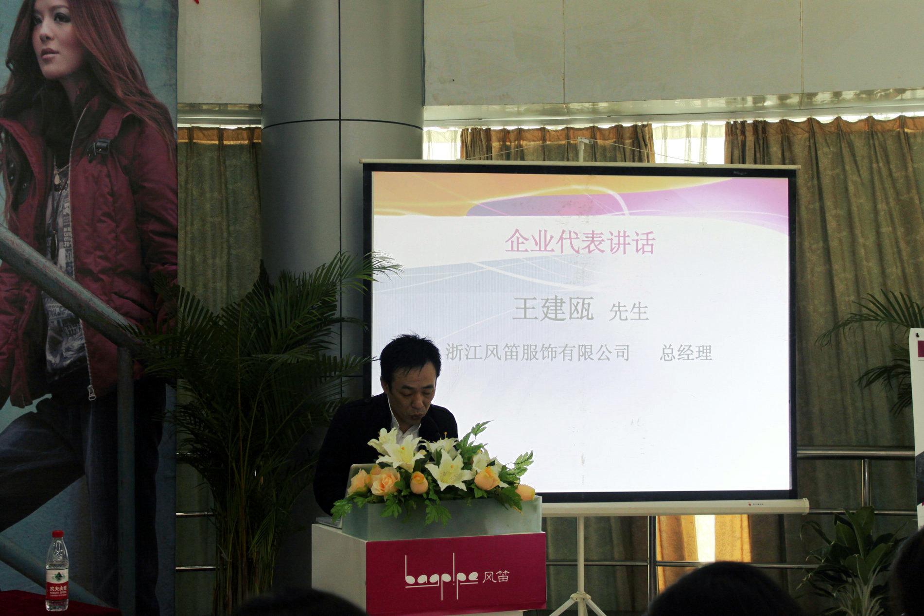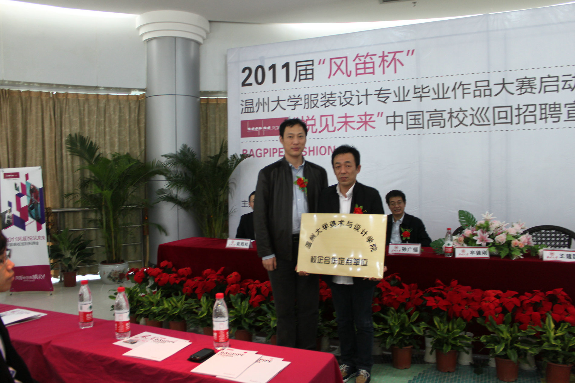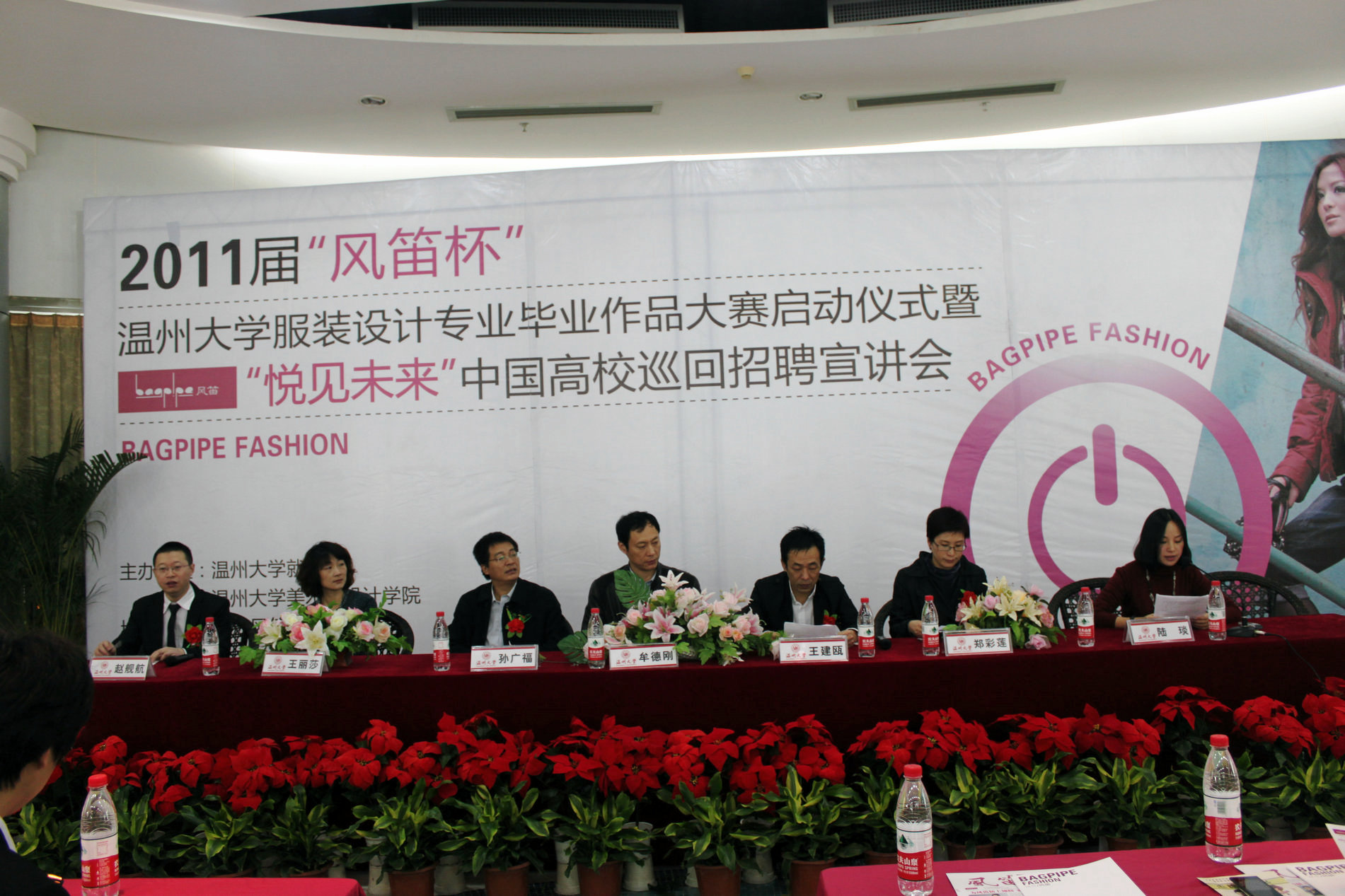 2010年11月21日上午九点,由beat365英国官方网站就业处和beat365英国官方网站联合主办的2011届“风笛杯”beat365英国官方网站服装设计毕业作品大赛启动仪式暨“悦见未来”中国高校巡回招聘宣讲会,在大学生活动中心茶吧隆重举行。beat365英国官方网站党委副书记牟德刚、beat365英国官方网站就业工作处处长孙广福、beat365英国官方网站党总支书记郑彩莲、浙江风笛服饰有限公司总经理王建瓯、首席设计师王丽莎、人资中心总监赵舰航出席了启动仪式,会议由beat365英国官方网站服装设计教研室主任陆琰主持。参加本次活动的还有beat365英国官方网站全体服装系学生。