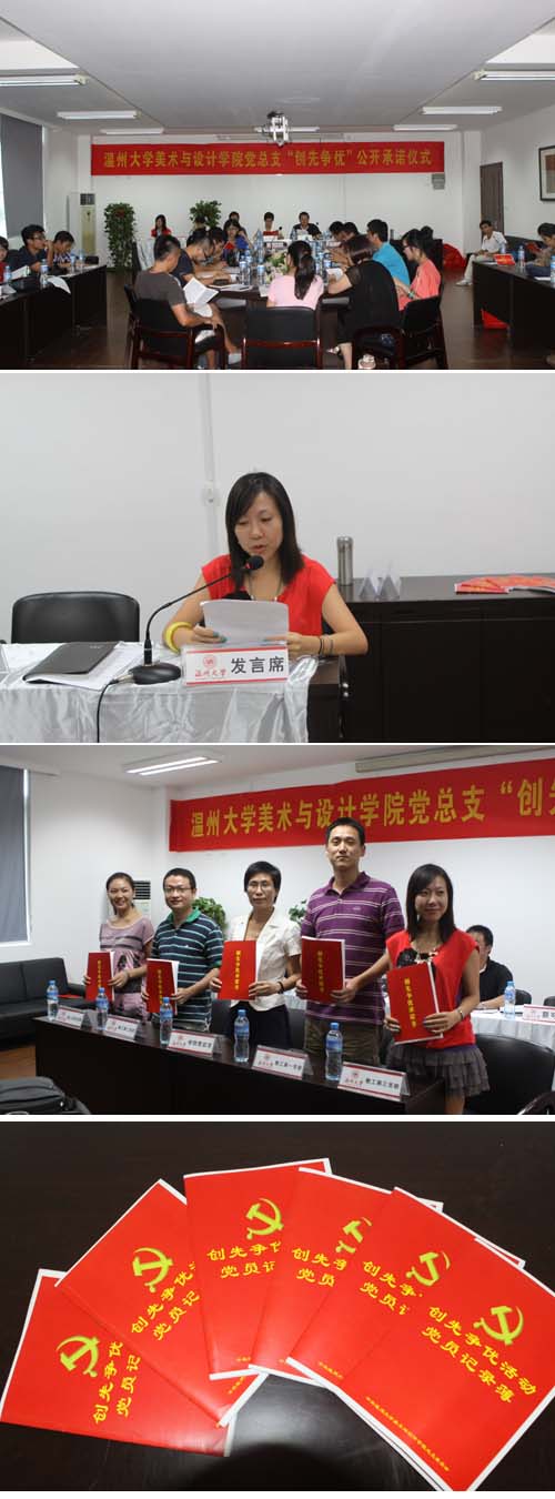 “我代表教工第一党支部在创先争优活动中作如下承诺:爱岗敬业,具有高度的责任观念。上课前认真备课,努力上好每一堂课,课后认真批改作业,尽心尽责地完成本职工作……”; “作为绘画基础支部,我们在科研、创作上保持于时具进的精神,提高自主创新的能力,积极申报课题,并努力创作出符合时代需求的艺术作品……” 9月21日,beat365英国官方网站党总支在2B4001会议室举行教工党员公开承诺仪式。学院党总支委员及全体教工党员参加了仪式。仪式由学院党总支副书记朱启鑫主持。朱启鑫在仪式上传达了总支创先争优活动推进会的会议精神,并宣读了《beat365英国官方网站党总支创先争优活动方案》。副院长李运河代表学院党总支宣读了总支承诺,随后,各教工支部书记代表各支部作公开承诺并在承诺书上签字。 仪式上,各支部的承诺充分体现了“争当岗位奉献标兵”、“创温大艺术先锋团队”、“亮牌示范争做育人成长表率”和“争当思政工作标兵”等内容。活动过程中,各教工支部从支部的工作实际出发,各具特点,确保了公开承诺不摆花架子、不走过场。在公开承诺前,各教工支部应学院发展和学生成长之所需、所急、所盼,将讨论意见进行汇总,力求承诺事项落到实处。 学院党总支书记郑彩莲郑作总结。她首先明确了创先争优活动的内涵和重要意义,希望通过公开承诺,接受群众监督,以提高教工党员的责任感和使命感。她要求各教工支部以总支的七大主题活动为纲,理清各支部创先争优活动的工作思路,把基础工作和创新工作相结合,深入扎实的开展创先争优活动,为学院的又快又好发展注入活力。 据悉,在创先争优活动中,美术学院党总支将推行承诺六法,即明确承诺、严查承诺、公示承诺、履行承诺、监督承诺和评议承诺,要求全体教工党员晒承诺,接受群众监督。