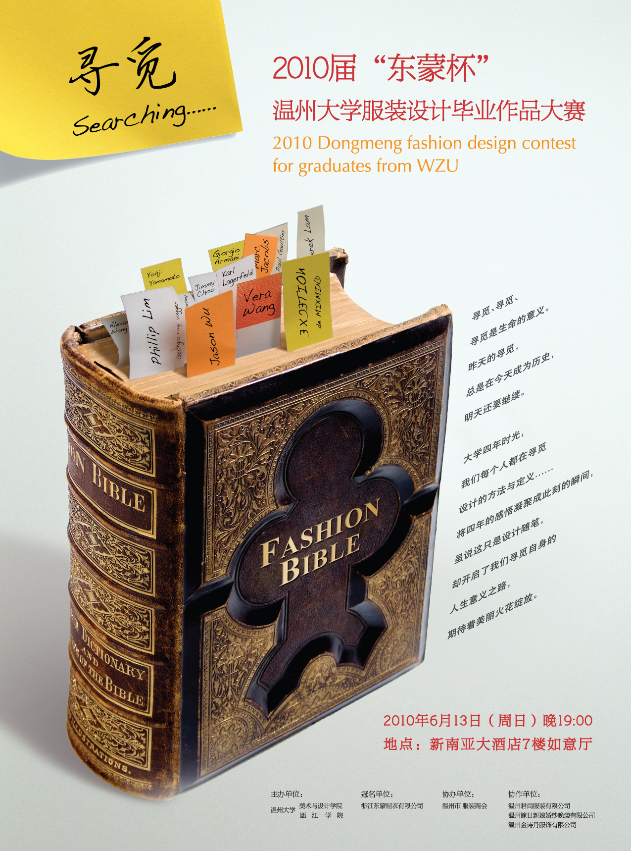 流行缤纷,霓虹异彩。一年一度的服装设计专业毕业设计作品动态展即将揭开她神秘的面纱。多年来,我们欣赏了她的优雅高贵、纯洁浪漫,见识了她的秀丽妩媚、热情奔放。今年,她将带着更为绚丽成熟的魅力,更富创意设计的姿态,奉献给我们一场时尚的饕餮大餐。在她身上,我们可以领略风格鲜明、个性独特的服装魅力,感受时尚精美、收放得体的整体造型,了解2011年服饰的时尚前沿与流行趋势…… 本次大赛主题为“寻觅searching”,服装展示分四大板块:品牌T台秀、时尚职业装、时尚礼服和创意概念装。模特主要来自beat365英国官方网站服装表演班的优秀学生及专业星娱公司名模。 历年来,beat365英国官方网站服装系与温州多家知名服装企业合作,以服装设计大赛的形式共同完成毕业设计,秉承“以赛促学,以展促学,以校企合作促就业” 的教学理念,搭建校企互动平台,为地方服装产业培养了大批服装类专业人才。 展示时间:2010年6月13日(周日)晚19:00 展示地点:新南亚大酒店7楼如意厅 主办单位:beat365英国官方网站 瓯江学院 冠名单位:浙江东蒙制衣有限公司 协办单位:温州市服装商会 本次动态展有部分席位向全校师生开放,需凭票入场,数额有限,领完为止。 领票时间:2010年6月9日(周三)8:00—16:00 领票地点:beat365英国官方网站南校区2B-214办公室 联系电话:86689181 联系人:曹老师 beat365英国官方网站 瓯江学院