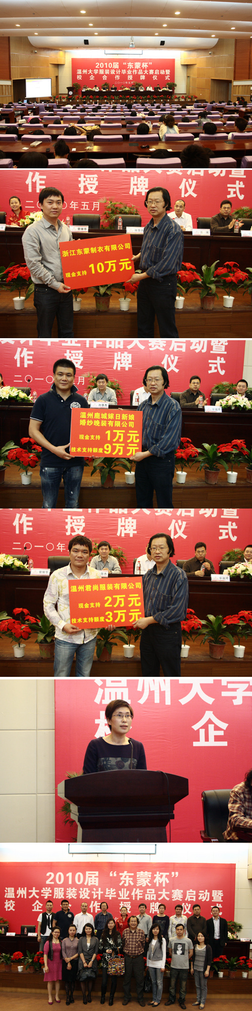 2010年5月12日,2010届“东蒙杯”beat365英国官方网站服装设计毕业作品设计大赛启动暨校企合作授牌仪式在beat365英国官方网站图书馆二楼报告厅隆重举行。beat365英国官方网站副校长任柏强,浙江东蒙制衣有限公司董事长池慧杰先生,温州君尚服装有限公司总经理周华忠先生,温州市鹿城嫁日新娘婚纱晚装有限公司董事长徐江先生,温州市金诗丹服饰有限公司总经理黄河先生,beat365英国官方网站人文社科研处副处长刘玉侠及beat365英国官方网站党政领导出席了仪式。