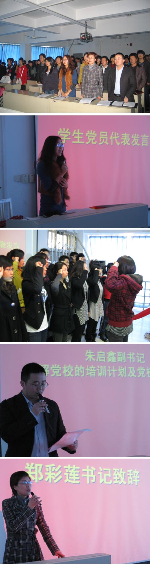 近日,beat365英国官方网站第十二期业余党校在学院党总支的高度重视和关心下,顺利开班。本期党校学生报名踊跃,经过筛选,共85位学生光荣的成为了本期党校学员。 2010年4月9日,beat365英国官方网站第十二期业余分党校开学典礼在美术楼2A308隆重举行。学院党总支书记郑彩莲、副书记朱启鑫,各学生党支部书记、学生党员代表及分党校学员等100余人参加了此次开班典礼。仪式由徐聿淼老师主持。 庄严的国歌声后,学生党员代表尹慧纯同学介绍了自身发展的经历,她勉励学弟学妹们要积极地向党组织靠拢,努力学习,提高自身各方面的知识和水平,争取早日加入党组织。学员代表学员发言。表示一定会认真学习好党的知识和精神,一定不会辜负党组织对他们的寄予和期望,一定会用实际行动证明他们是优秀的,为学院的发展贡献自己的一份力量。 郑彩莲书记代表学院党总支对能参加本次业余党校的同学表示祝贺,同时希望大家能认真对待本次机会,努力学习,争取能以优异的成绩向党组织汇报。并对学员提出三点希望。首先希望学员能通过学习,加深对党组织的认识;其次,她希望学员能持之以恒,通过自己的实际行动,处处体现先锋模范作用。最后,她希望全体学员能在党校的学习中,遵守纪律,认真学习,争取早日在思想上入党进而在组织上入党,并预祝本次培训班取得圆满成功。 学院党总支副书记朱启鑫就本期党校学习计划、学习要求等做了安排。班主任李剑军老师宣布了班委组成成员,并就分党校的有关规章制度作了详细的说明。 最后,在开学典礼上学院32名新学生党员在徐聿淼老师的带领下庄严宣誓,表达了对党的忠诚以及为共产主义事业奋斗终身的决心。这种庄严、激情的气氛深深地感染了党校学员们。 据悉,本次业余党校在1个多月的时间里通过理论学习、观看红色影像、分组讨论、辅导报告等理论与实践相结合的方式学习党的知识。