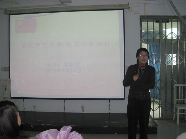 2010年4月14日星期三下午,beat365英国官方网站第12期院党校第一讲——“大学生的学习动机”在2A308顺利召开,由美院党总支书记郑彩莲老师担任主讲人。