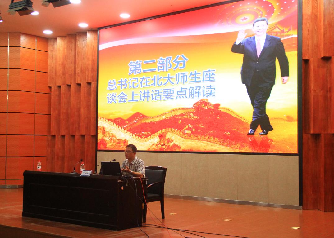7月4日下午,beat365英国官方网站在岩松堂雁山厅组织开展形势与政策课教学,学院党总支副书记杨振海为17级全体同学做“坚持立德树人培养时代青年 加快内涵发展建设高教强国——习近平总书记在北大师生座谈会上的讲话精神解读”报告。杨书记报告分为三部分,第一部分是总书记莅临北京大学考察的简要回顾,第二部分是总书记在北大师生座谈会上讲话的要点解读,第三部分是学习习近平总书记讲话精神要自觉增强五个自觉。杨书记指出,习近平总书记在北大师生座谈会上的讲话是当的十九大以来,总书记面向高等教育乃至整个教育战线发表的首次重要讲话,对新时代的高等教育工作做出了系统论述,具有很强的战略性、政治性、思想性和针对性,是习近平新时代中国特色社会主义思想的重要内容,是深化教育综合改革、办好社会主义大学的根本遵循,也是青年学生成长成才的行动指南。杨书记认为,总书记的讲话围绕“我们要培养什么样的人”“怎样培养我们需要的人”“青少年怎样成为这样的人”三个问题,分别从我国高等教育的一个根本任务、建设中国特色世界一流大学的三项基础性工作和对新时代青年的四点希望三个方面进行了深刻阐述。杨书记总结了学习习近平总书记讲话精神要增强五个自觉,一要增强走中国特色社会主义道路的自觉;二要增强加快高等教育内涵式发展的自觉;三要增强高等教育服务国家和社会的自觉;四要增强高校加强和改进党的领导的自觉;五要增强青年大学生全面成长成才的自觉。最后,杨书记勉励全体同学要不忘初心、牢记使命,关注时事政治,努力充实文化知识和专业技能,为实现中华民族伟大复兴的中国梦贡献青年大学生应有的力量。
