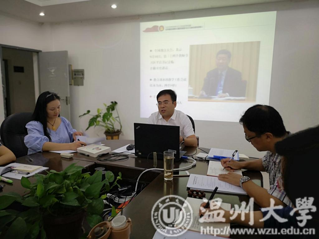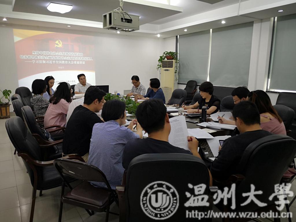9月26日下午,beat365英国官方网站在2B216召开党总支中心组理论学习(扩大)会暨党务工作例会,传达学习习近平总书记2018年9月10日在全国教育大会上的讲话精神和省委教育工委副书记陈根芳同志在高校高知识群体中发展党员工作座谈会上的讲话精神。学院党政班子成员、总支委员、支部书记、系主任、各科、教研室主任以及研究生支部副书记参加学习。会议由学院党总支副书记杨振海主持。