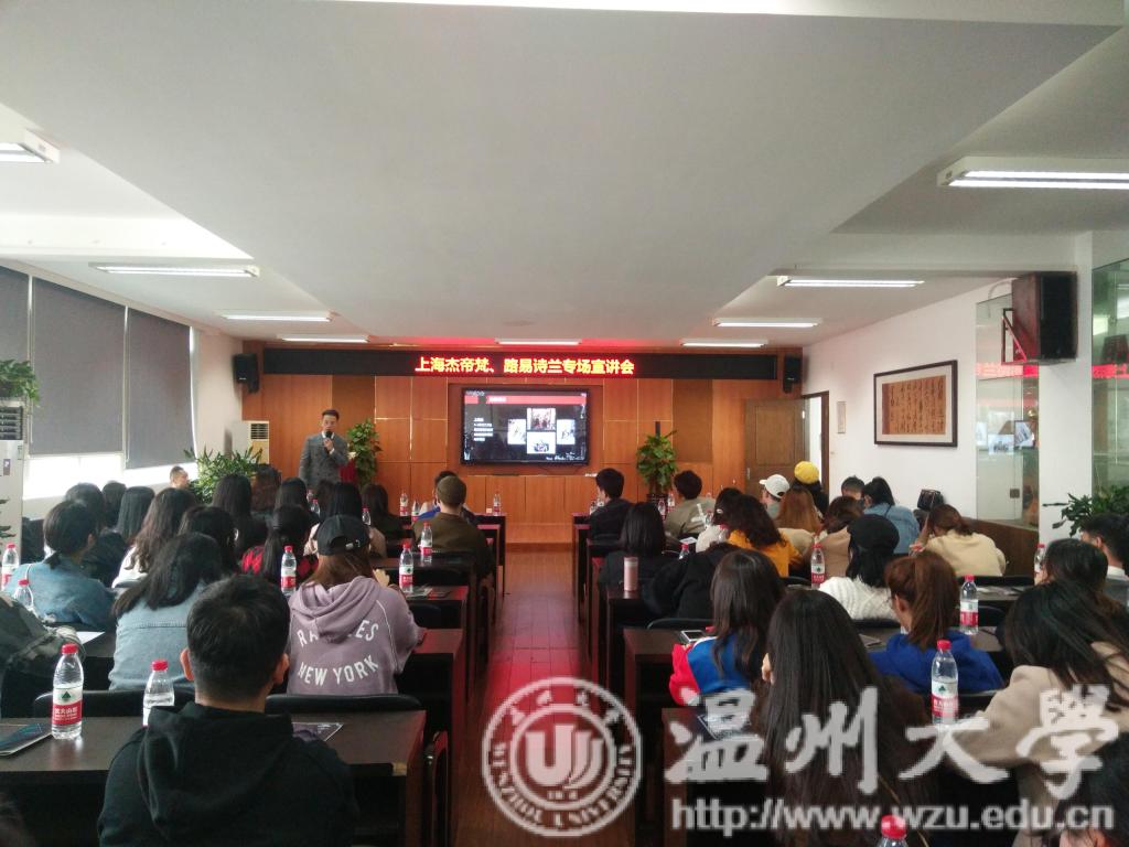 11月23日上午,由上海杰帝梵、路易诗兰组织的beat365英国官方网站专场宣讲会在美院2B4001成功举行。出席此次宣讲会的主要宣讲人有杰帝梵和路易诗兰的战略部总经理朱量和培训部经理陈超群。会议内容主要是品牌的概述、管培生项目的介绍以及面试的流程。