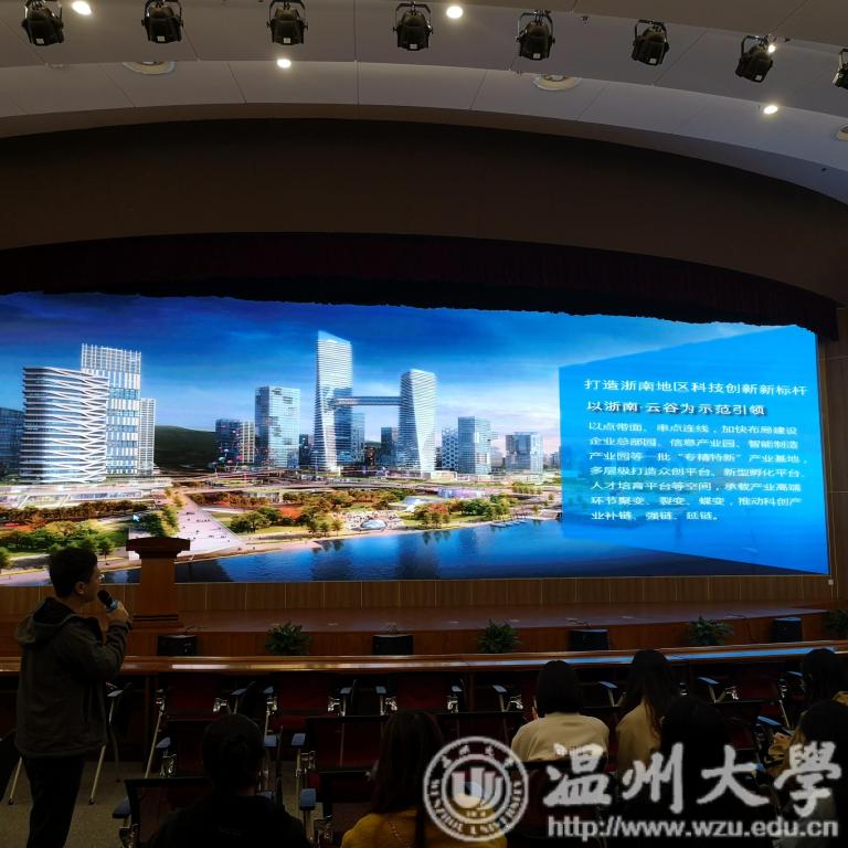 接待员在向同学们解释浙南科技城的构成部分
