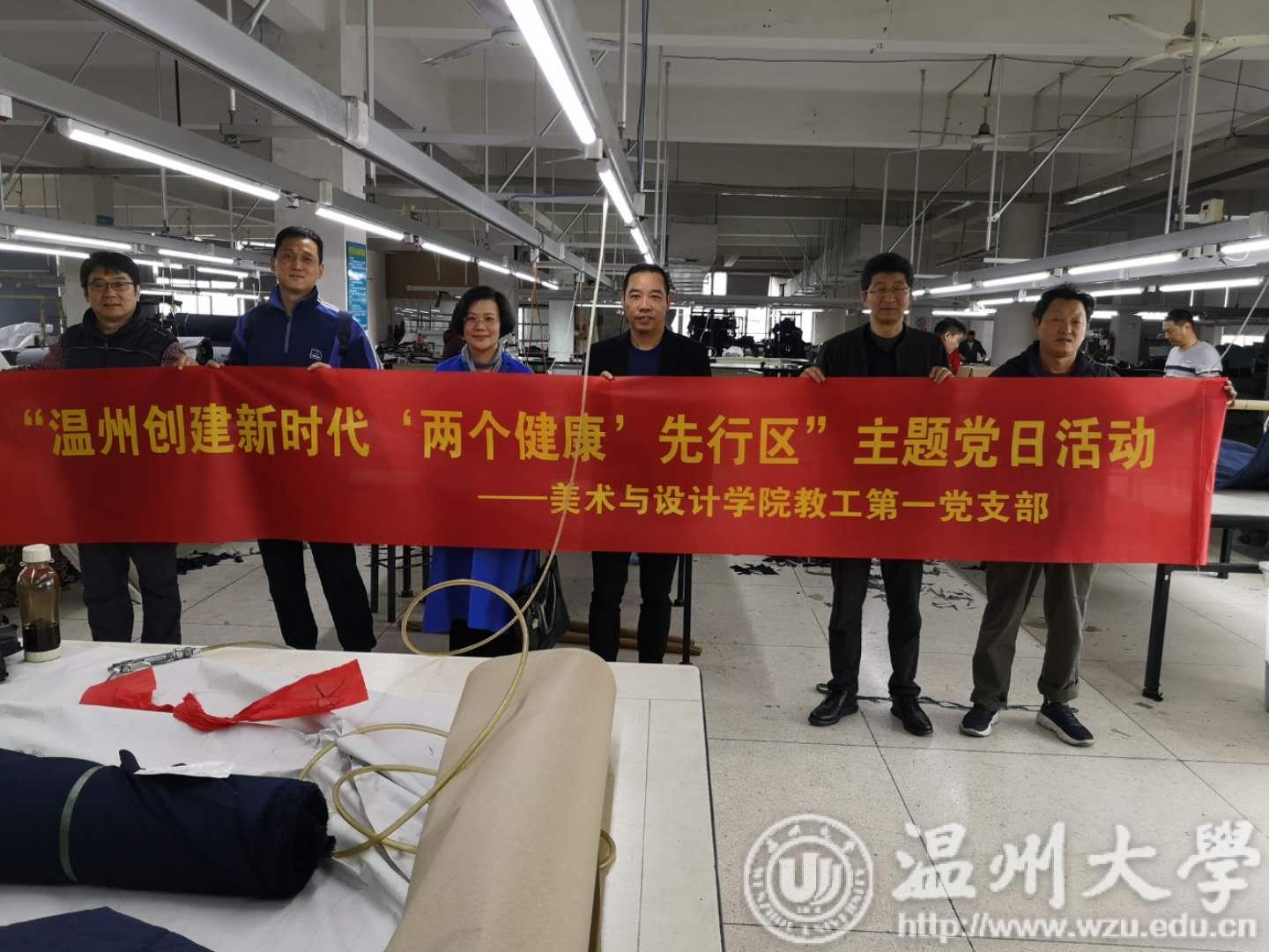 3月20日beat365英国官方网站教工第一党支部全体党员教师下基层民营企业,走访温州伽玛仕服饰有限公司,开展关于“温州创建新时代`两个健康'先行区”的主题党日活动。伽玛仕服饰有限公司董事长、党支部书记以及总设计师陪同我支部党员教师参观了该公司生产线,并在会议室中共同学习了习近平总书记在去年11月1日召开的民营企业座谈会上的讲话。