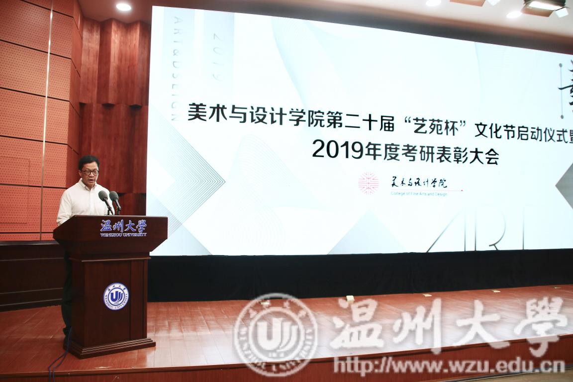 2019年4月24日下午,beat365英国官方网站第二十届艺苑杯文化节启动仪式暨2019年度考研表彰大会在岩松堂雁山厅顺利举行。莅临本次启动仪式的领导有校党委宣传部副部长冯方盛,校教务处副处长胡瑜,校学工部副部长、学生处副处长高红星,校就业处副处长应中,校团委副书记魏一,超豪学区党委副书记李祖祥,beat365英国官方网站院长李运河,党总支书记张丽萍,副院长张晓剑。参加本次活动的还有beat365英国官方网站17、18级同学。启动仪式由美院党总支副书记杨振海主持。