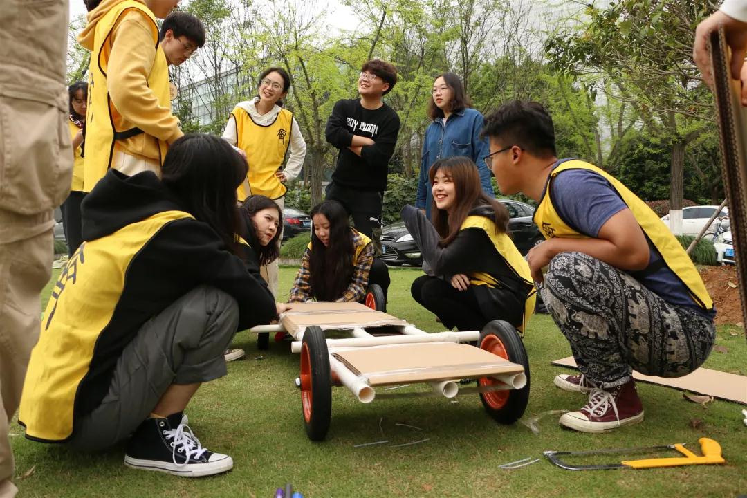 接着干事们开始了最终大比拼——造车。首先要确定每个队的驾驶员、车模、讲解师。一开始干事们显得有点手足无措,无从下手,但在每个队队长的指挥下慢慢的步入了正轨,干事们分工明确,有条不紊,一部分人做车底座,另一部分人做车身。