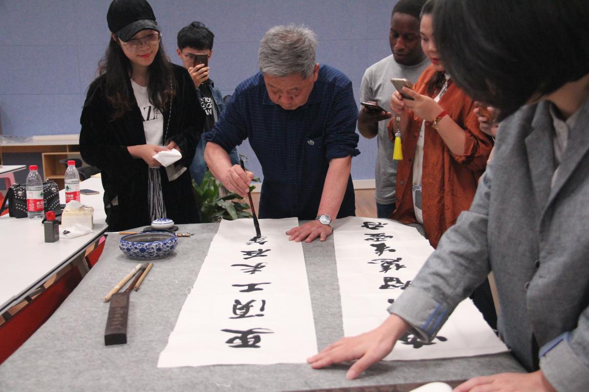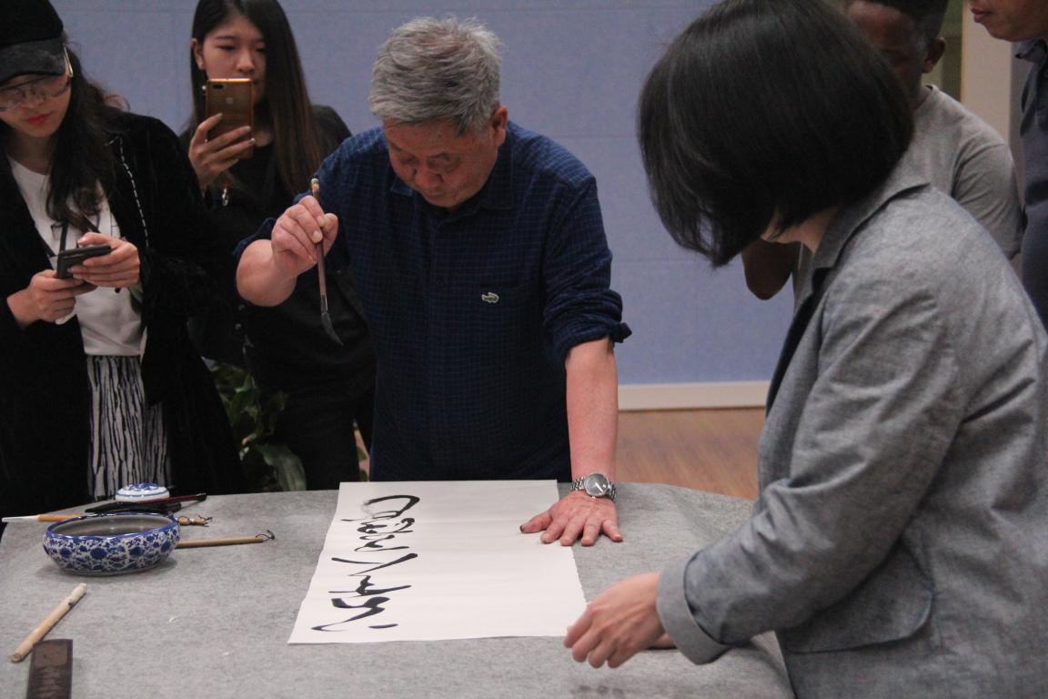 讲座结束后,马亦钊老师现场挥毫泼墨,创作出一幅精美的书法作品赠送给beat365英国官方网站,李运河院长和张丽萍书记接受赠送并做答谢。